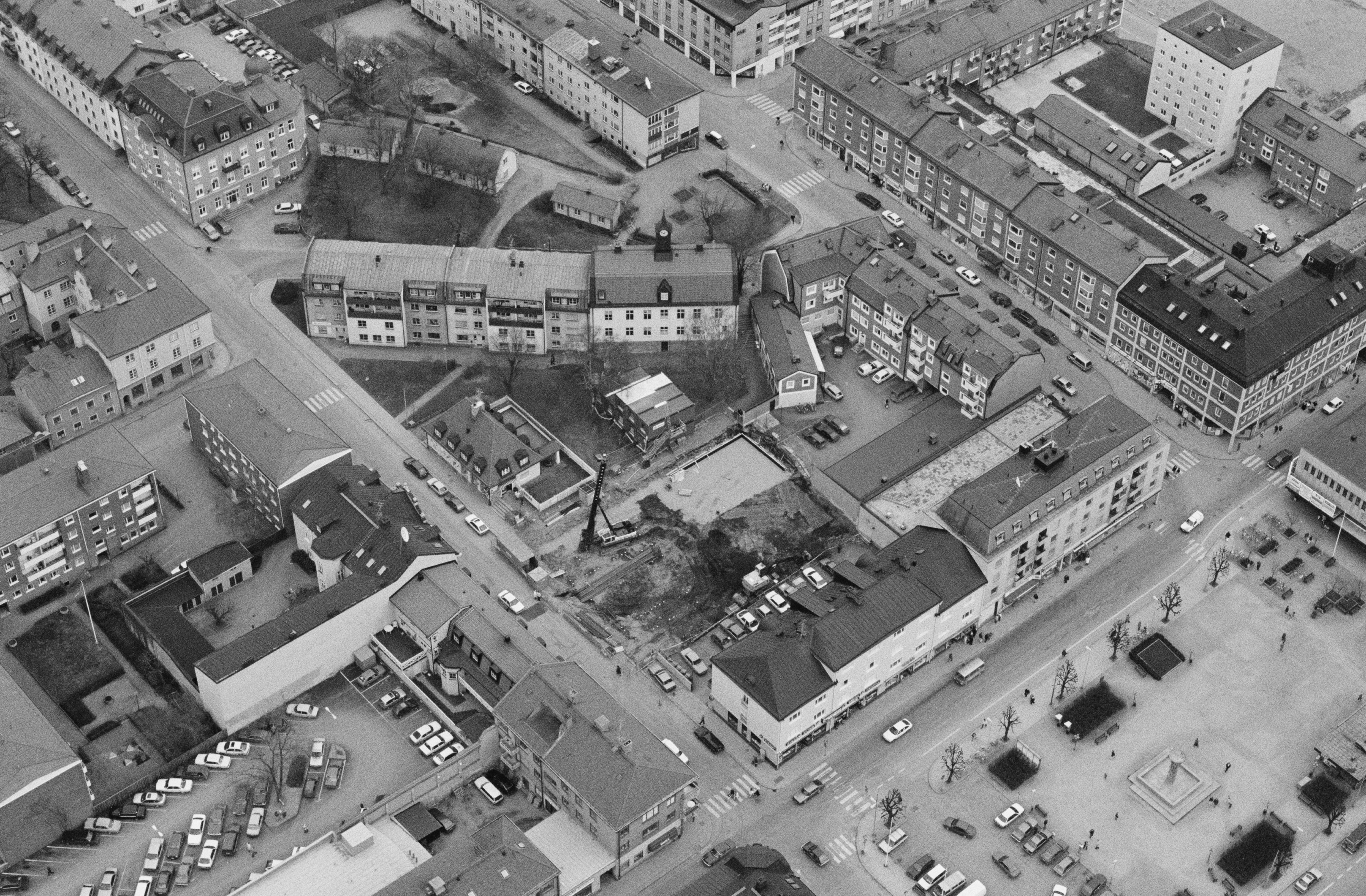 Beskrivning: Enköpings stad. Arkeologisk undersökning av stadslager RAÄnr Enköping 26:1 i kvarteret Borgmästaren (vid bildens mitt). Bilden är tagen mot (väderstreck): ONO