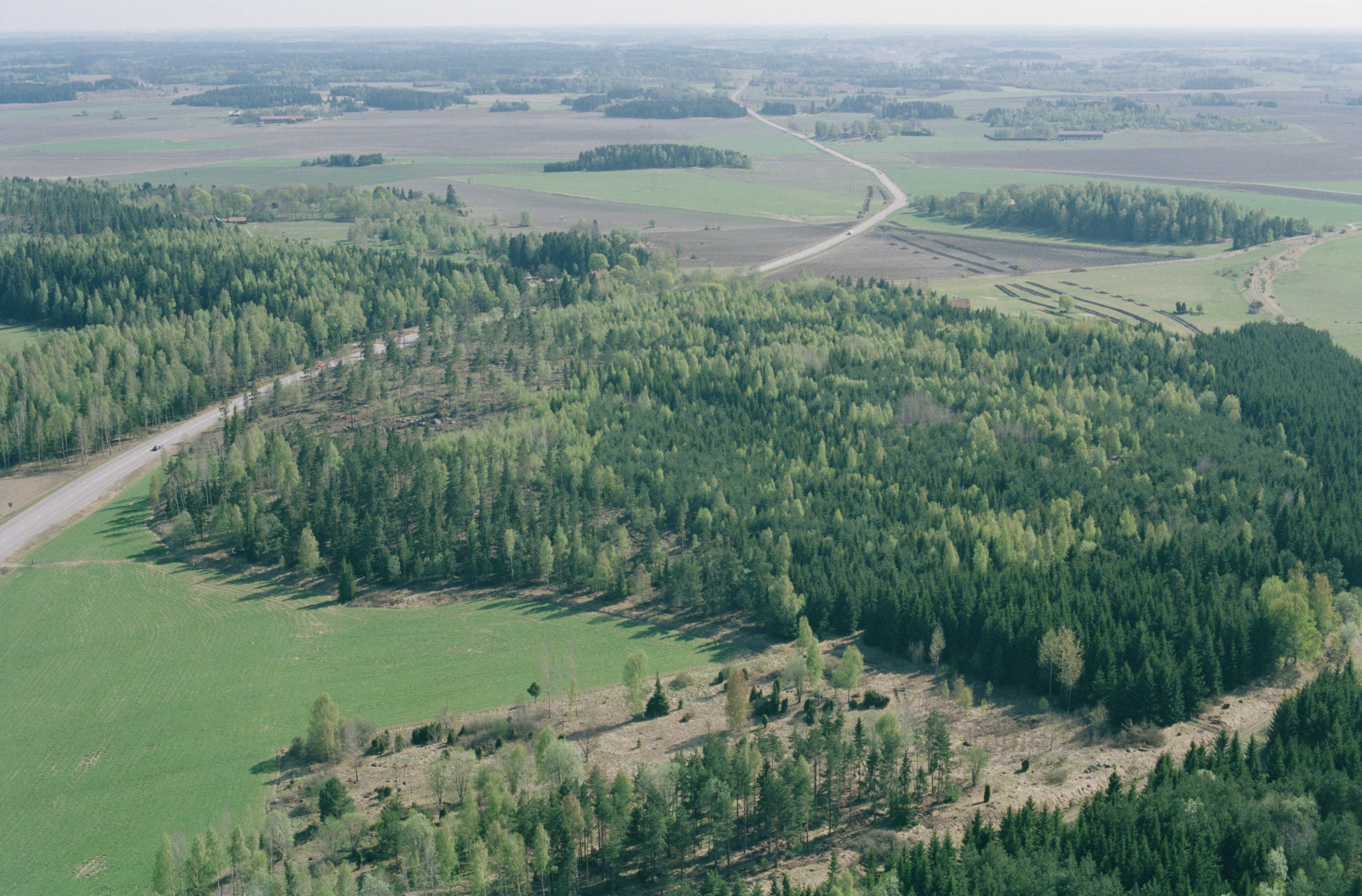 Beskrivning: Till höger över bildens mitt vägstakning och arkeologisk undersökning innan bygge av väg 55 vid bo- och gravplats RAÄnr Fröslunda 100:1 i Varsta by. I bilddens övre del socknen Giresta och Litslena. Bilden är tagen mot (väderstreck): S