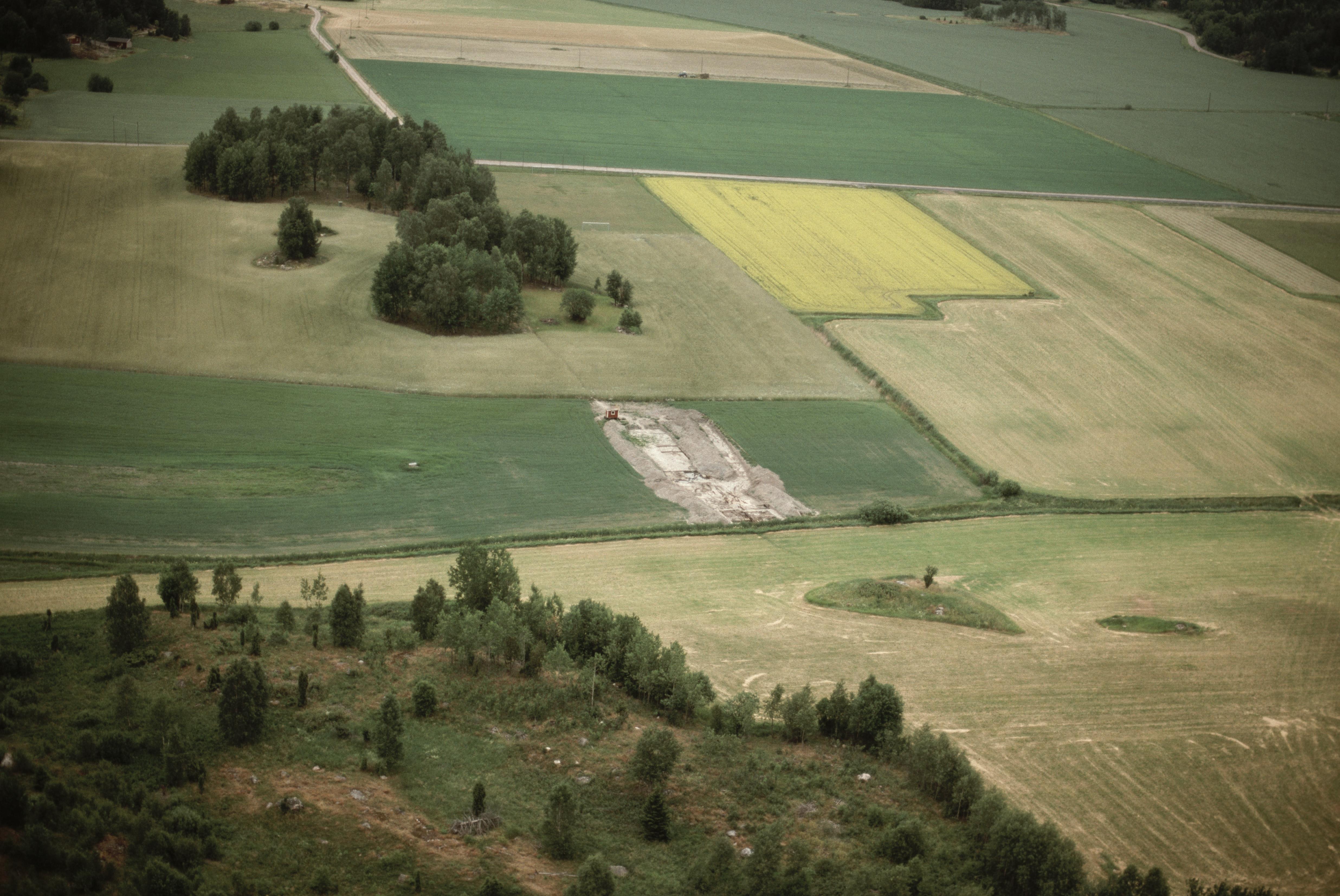 Beskrivning: Vid bildens mitt arkeologisk undersökning av bro och fornväg RAÄnr Gottröra 64:1 vid Lindbergaån. Bilden är tagen mot (väderstreck): NNO