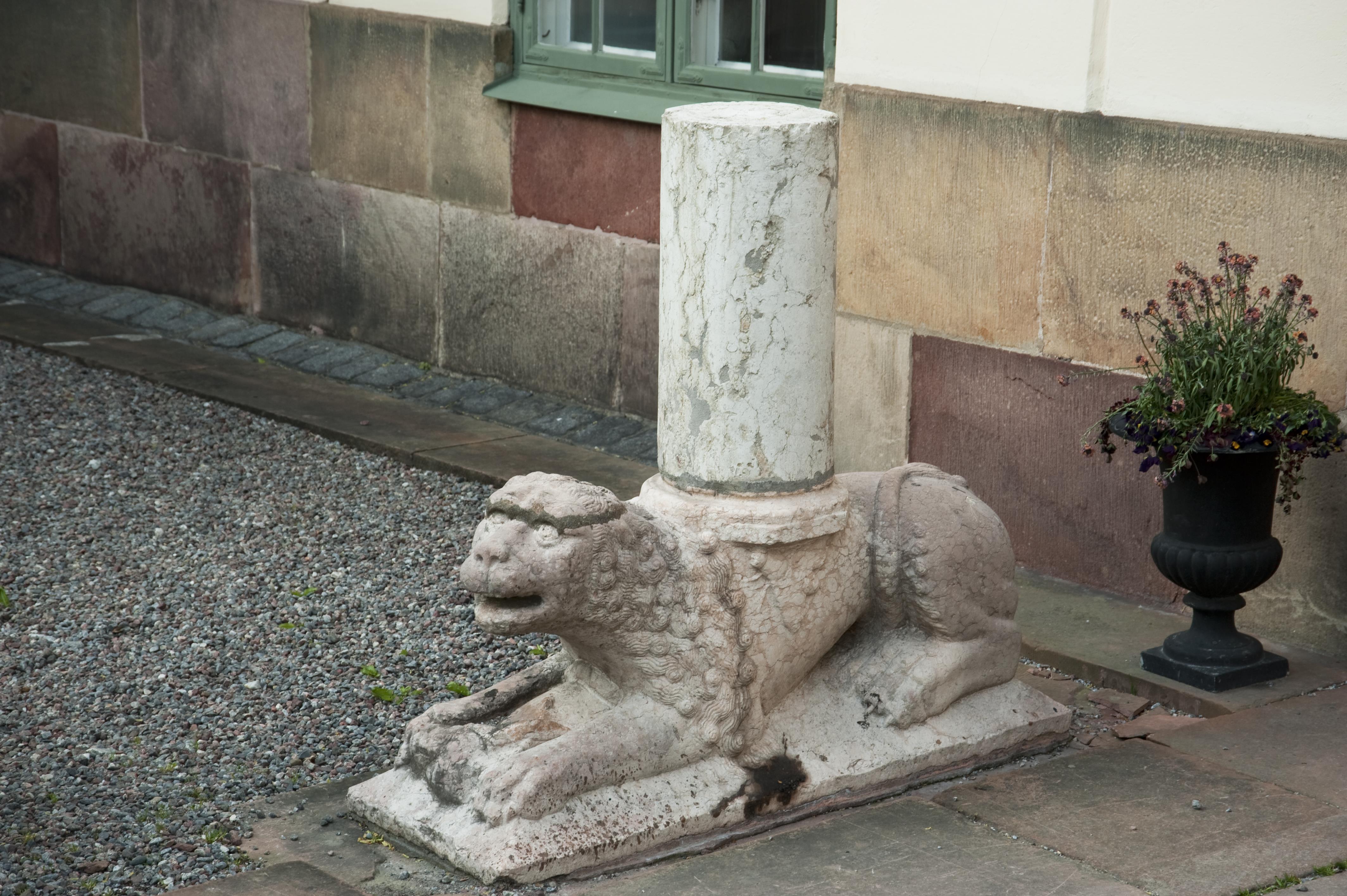 Beskrivning: Urnhållare, lejon med kolonn och urna på ryggen vid entrén