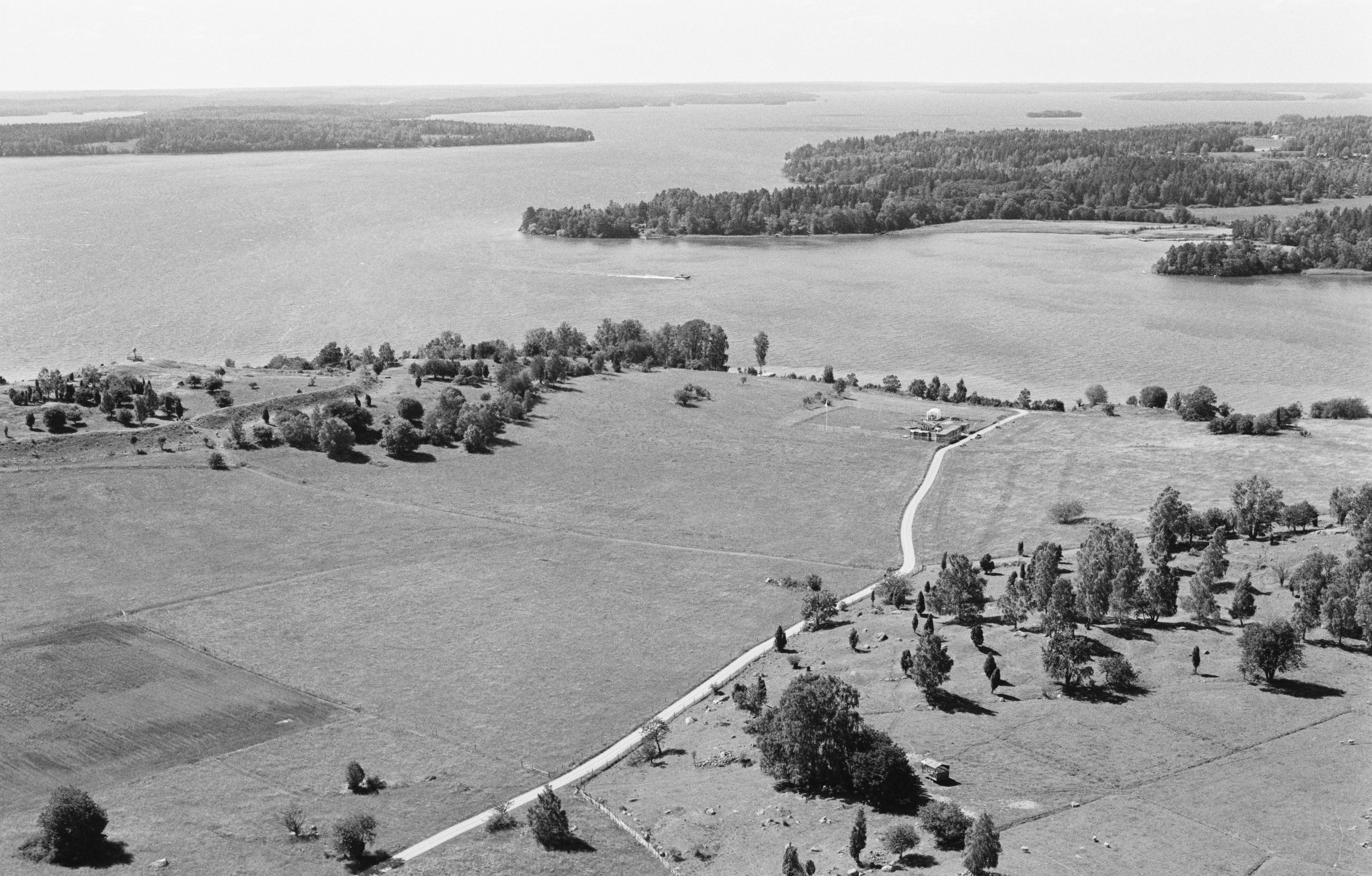 Beskrivning: Fornlämningsområdet Birka på Björkö i Mälaren. Till höger om bildens mitt arkeologisk undersökning i norra delen av ön i området Hemlanden och Svarta jorden RAÄnr Adelsö 118:1 vid Stadsvallen Adelsö 119:1-2. Adelsön uppe till höger. Bilden är tagen mot (väderstreck): VNV