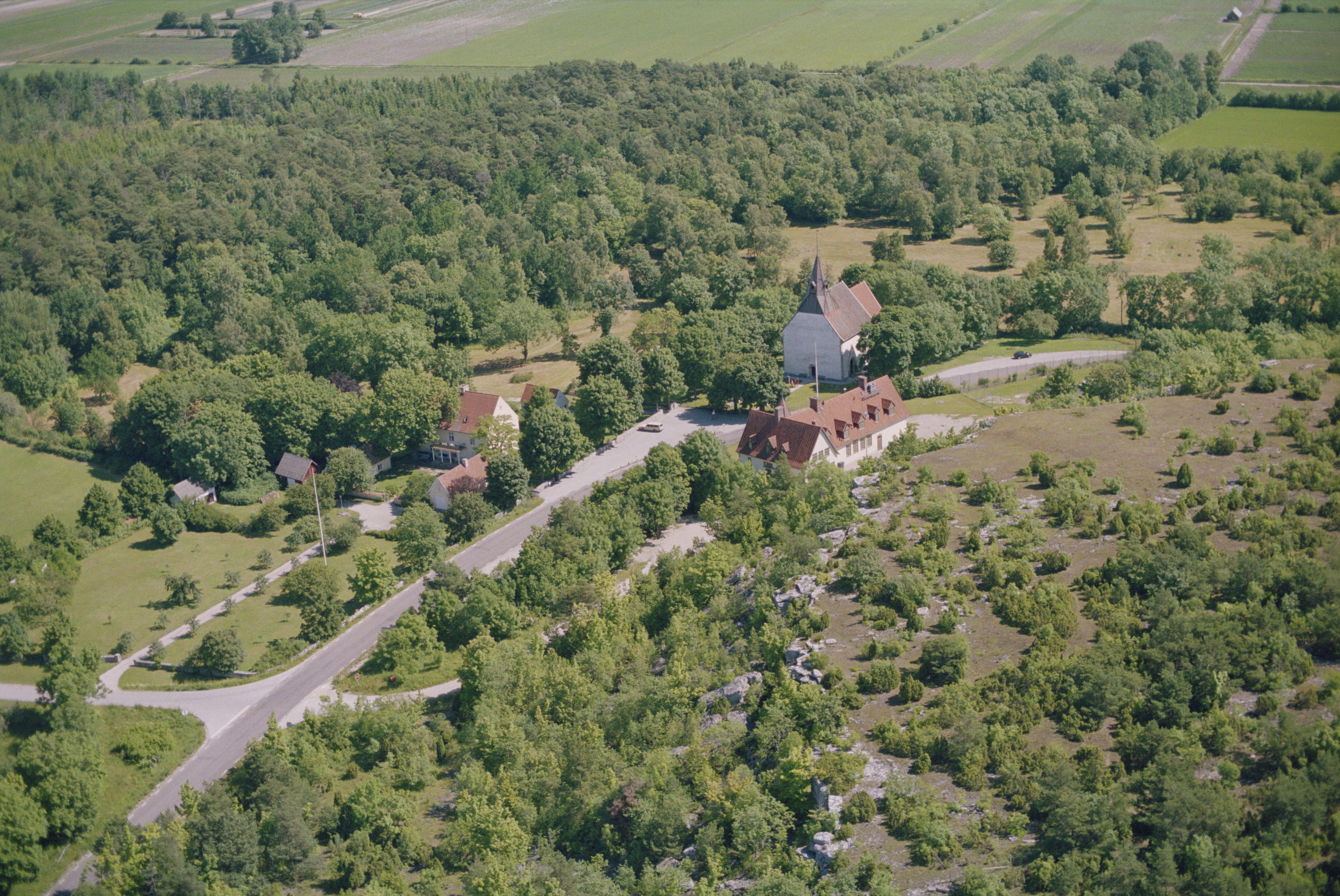 Beskrivning: Östergarns kyrkby. Östergarns kyrka till höger över bildens mitt och Östergarns skola till höger om bildens mitt. En plats med tradition RAÄnr Östergarn 72:1 nere i bildens högra hörn. Bilden är tagen mot (väderstreck): NO