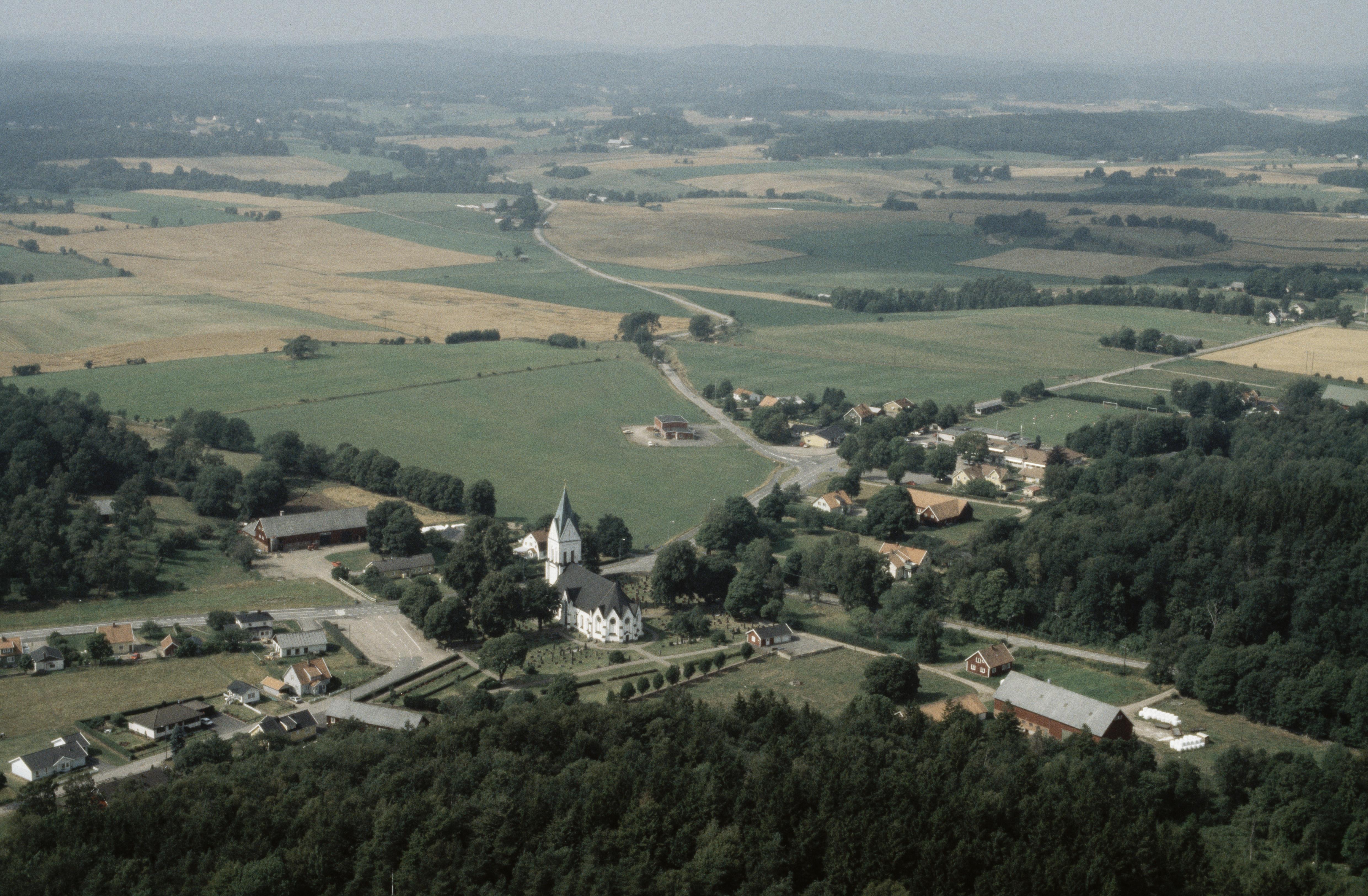 Beskrivning: Okome kyrka och kyrkby i Ätradalen. Bilden är tagen mot (väderstreck): NV