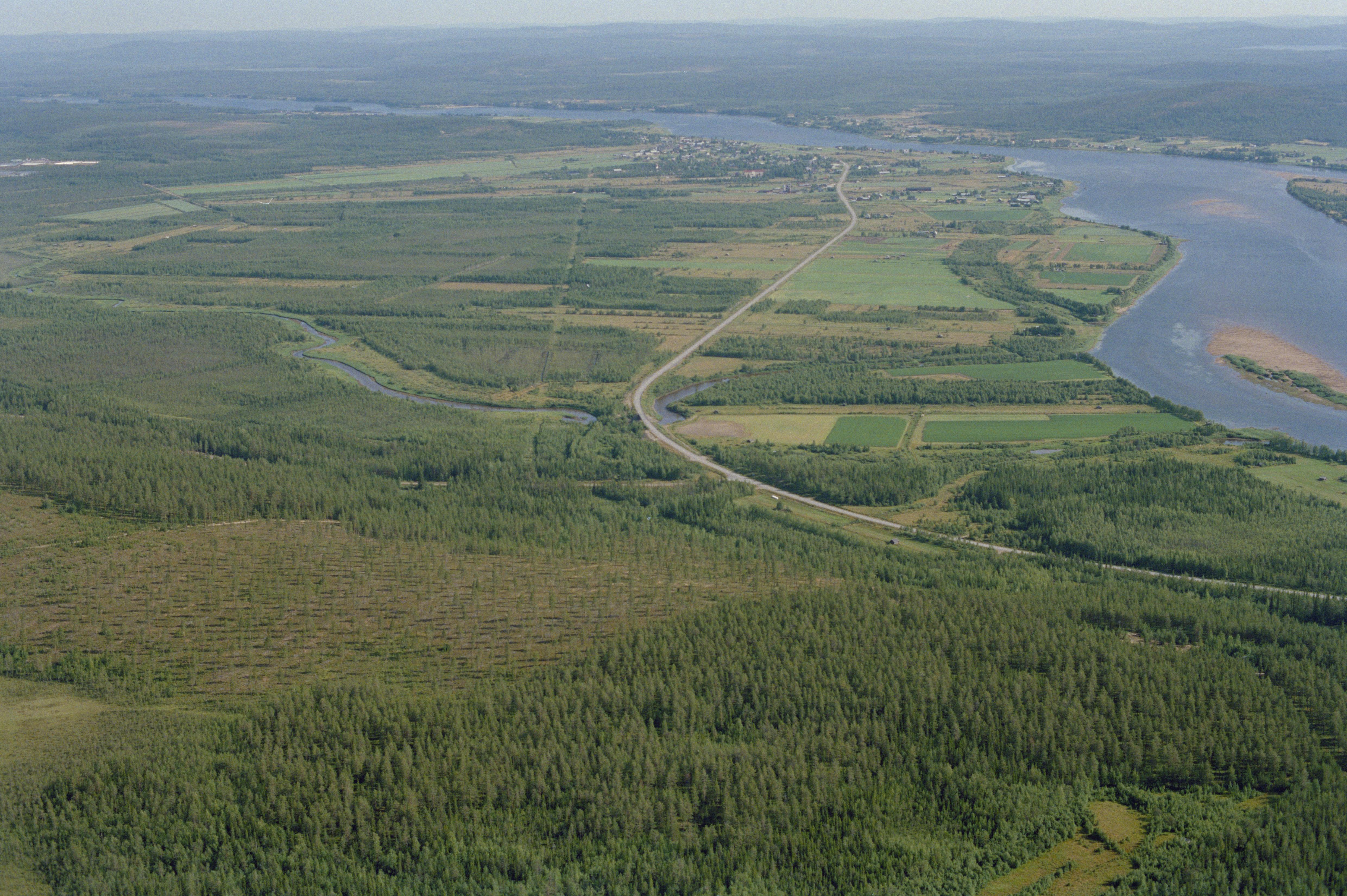 Beskrivning: Torneälven i Tornedalen. I bildens nedre del byn Niskanpää söder om ån Juovojas mynning. Vid Juovoja till vänster om bildens mitt tjärdal / tjärgrop RAÄnr Övertorneå 532:1-3. Över bildens mitt byn Juoksengi (Juoksenki). Torneälven markerar riksgränsen mot Finland (uppe till höger). Bilden är tagen mot (väderstreck): NNO