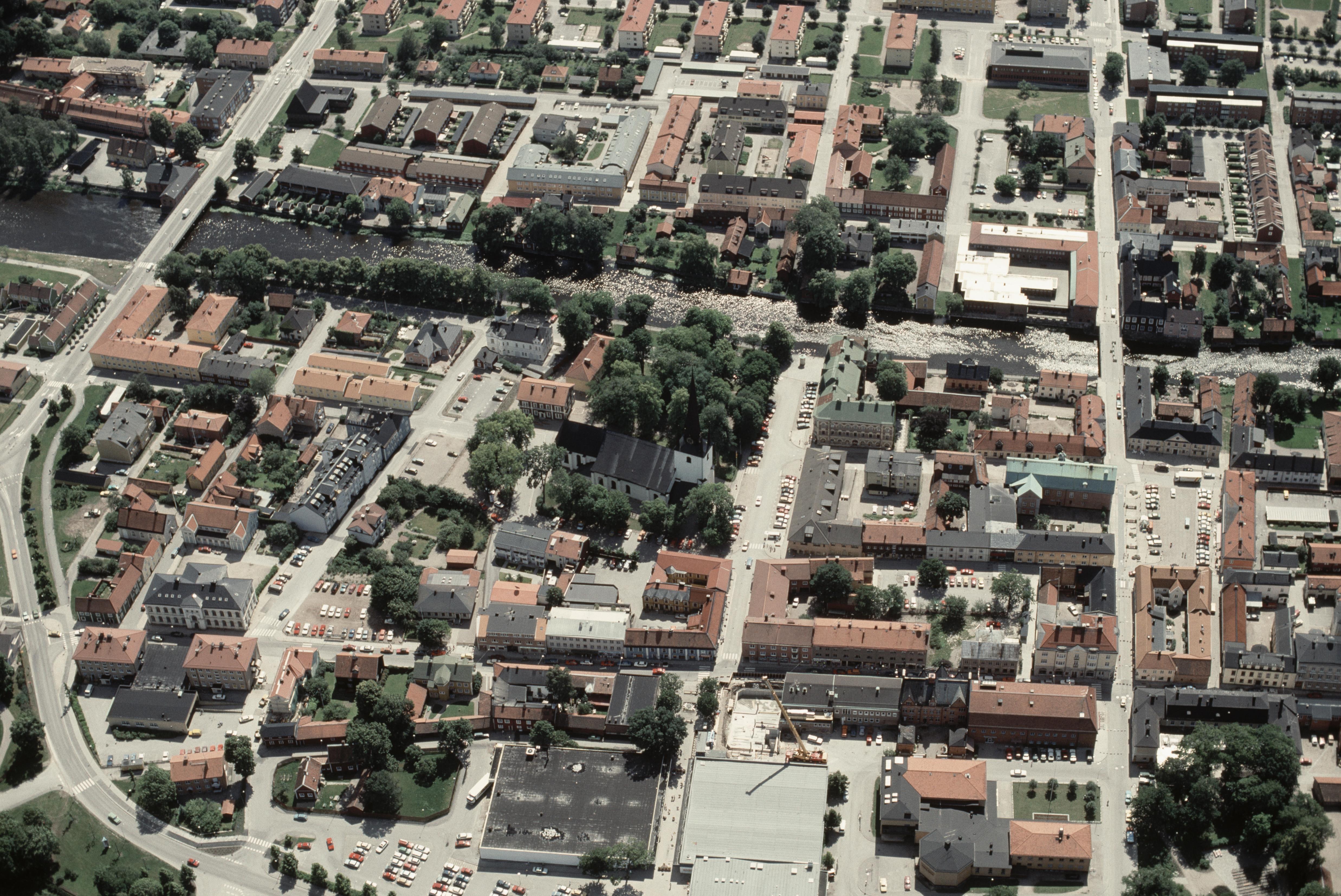 Beskrivning: Arboga stad vid Arbogaån. Heliga Trefaldighetskyrka i stadslager RAÄnr Arboga stad 34:1 i bildens mitt. Bilden är tagen mot (väderstreck): SSO