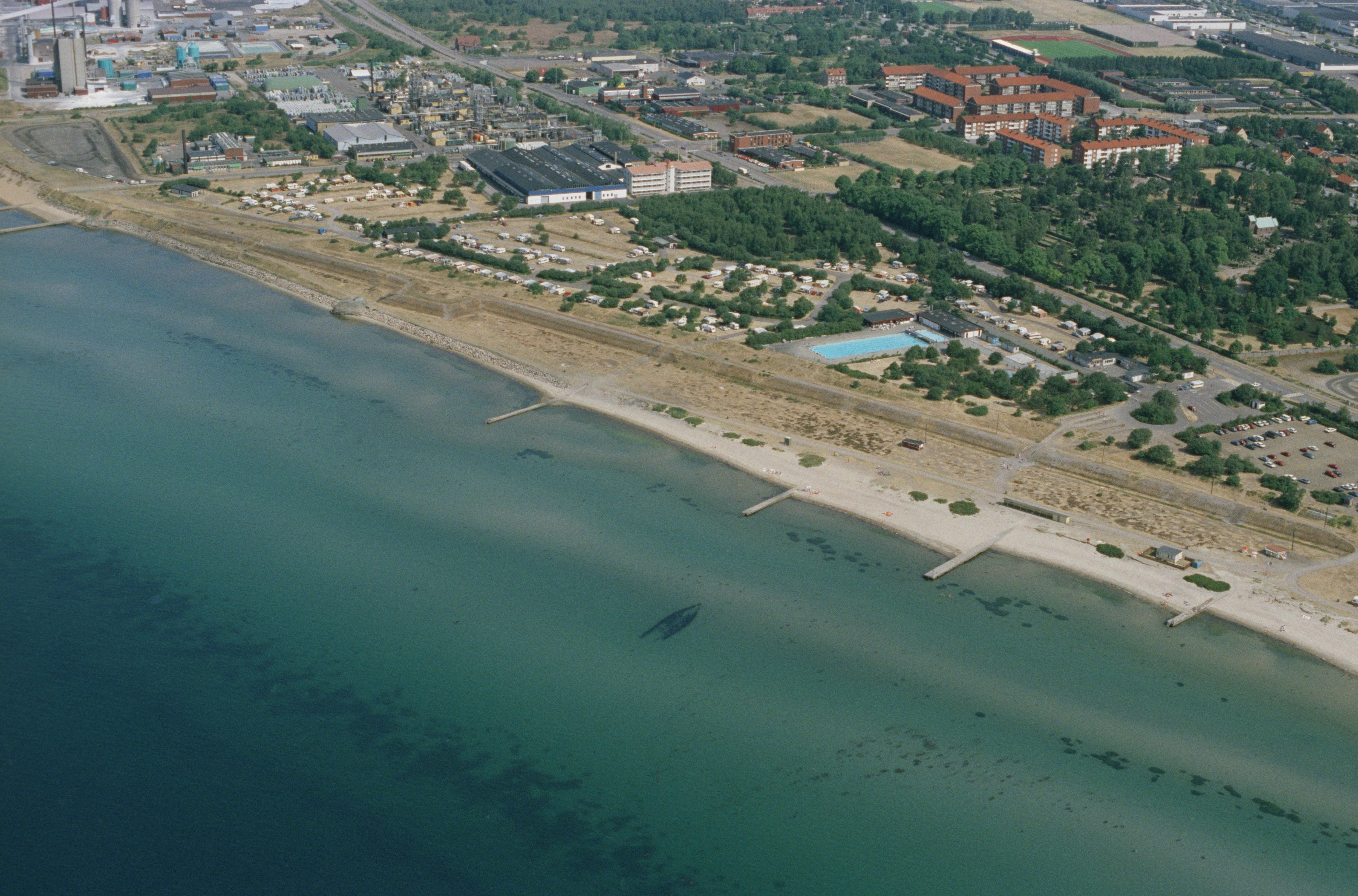 Beskrivning: (Tidigare Raus socken). Campingplats, badplats. Råå vallar RAÄnr Helsingborg 92:1 vid stranden. Ett skeppsvrak i vattnet vid bildens mitt. Bilden är tagen mot (väderstreck): NO