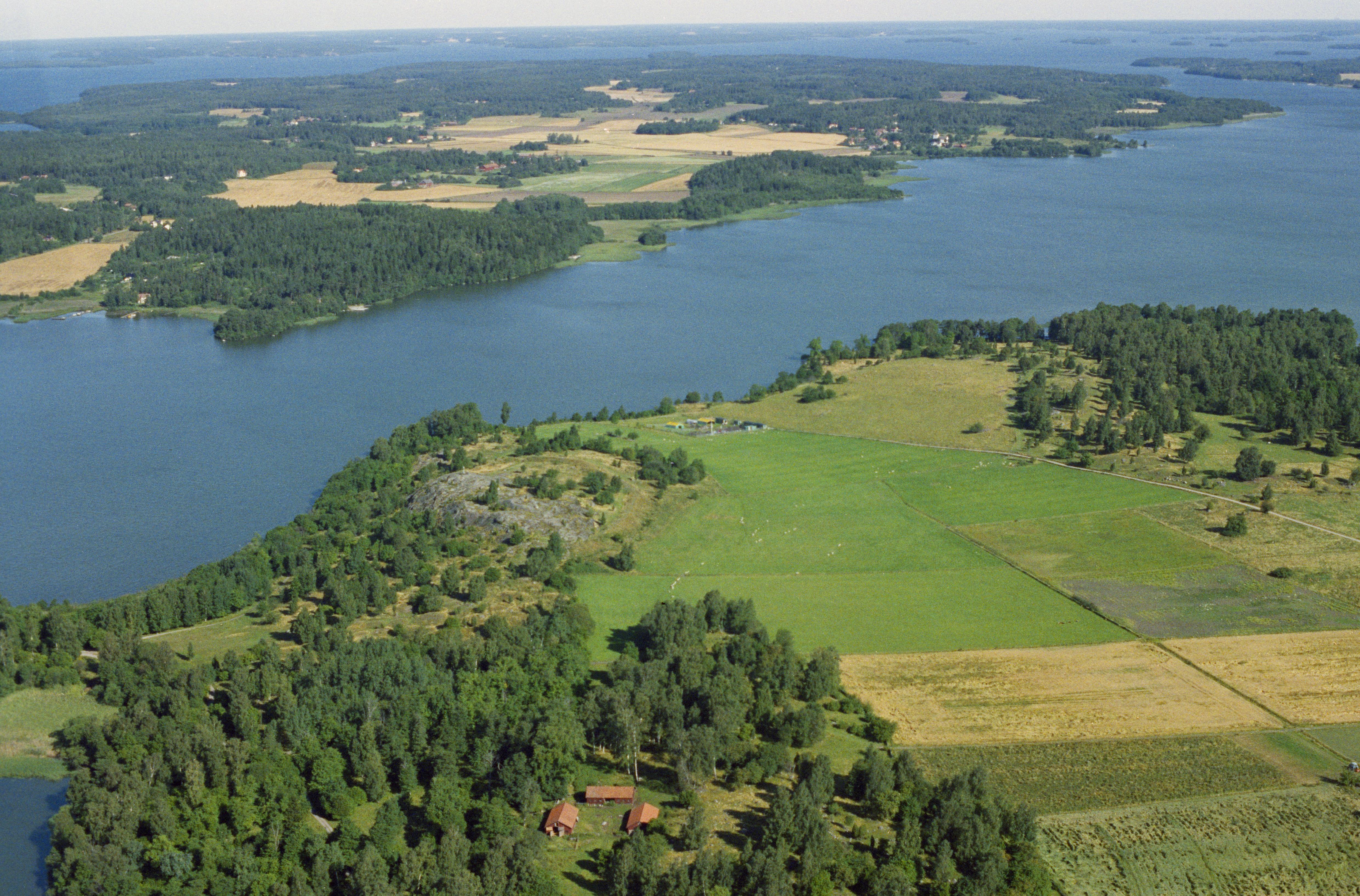 Beskrivning: Fornlämningsområdet Birka på Björkö i Mälaren. Vid bildens mitt fornborg Borg RAÄnr Adelsö 34:1 och arkeologisk undersökning i norra delen av ön i bo- och gravplats Hemlanden och Svarta jorden RAÄnr Adelsö 118:1 vid Stadsvallen Adelsö 119:1-2. Adelsön i bildens övre del. Bilden är tagen mot (väderstreck): NNV