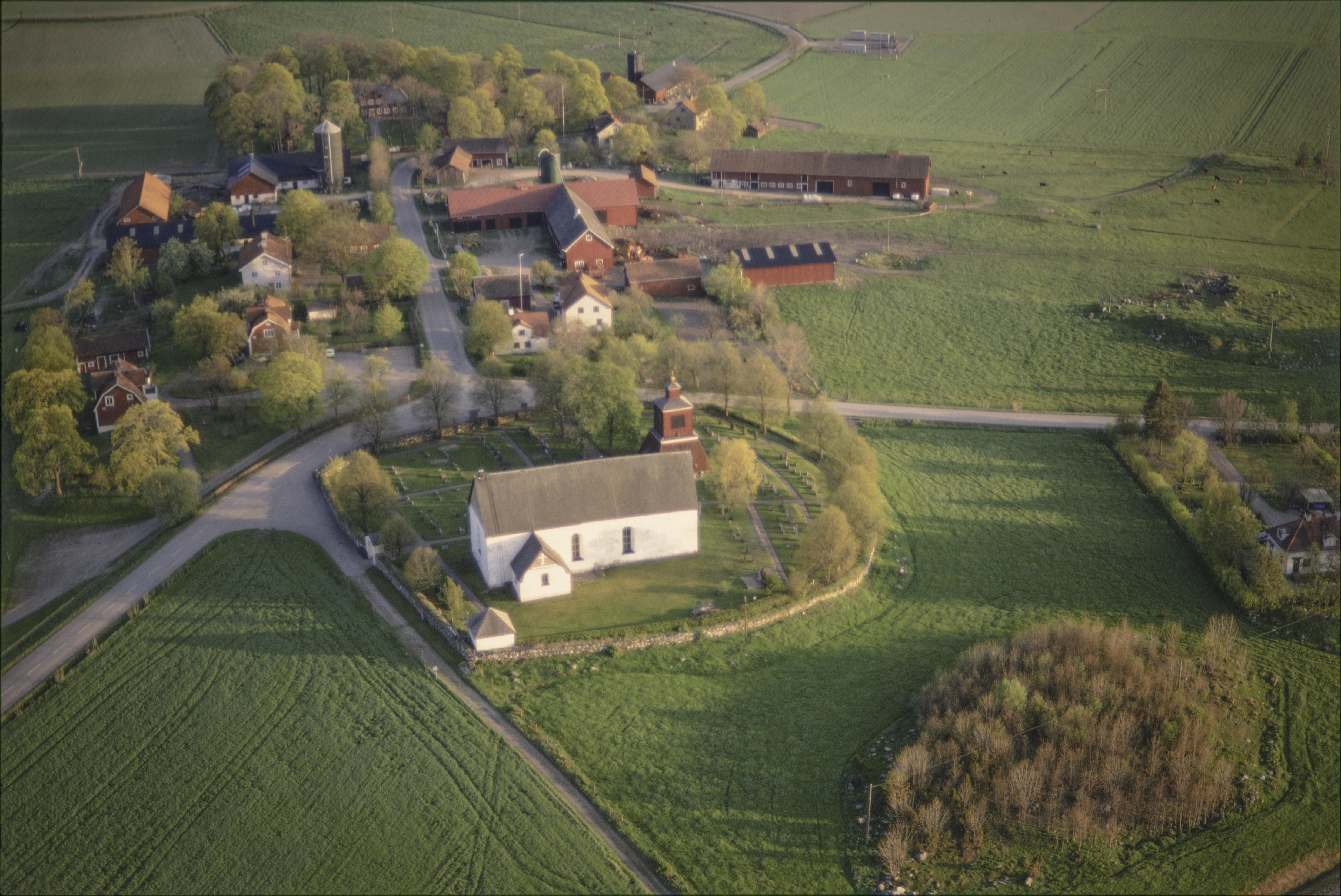 Beskrivning: Husby-Långhundra kyrka i Husby kyrkby vid Långhundraleden. Tilasgården i bildens övre del. Bilden är tagen mot (väderstreck): S