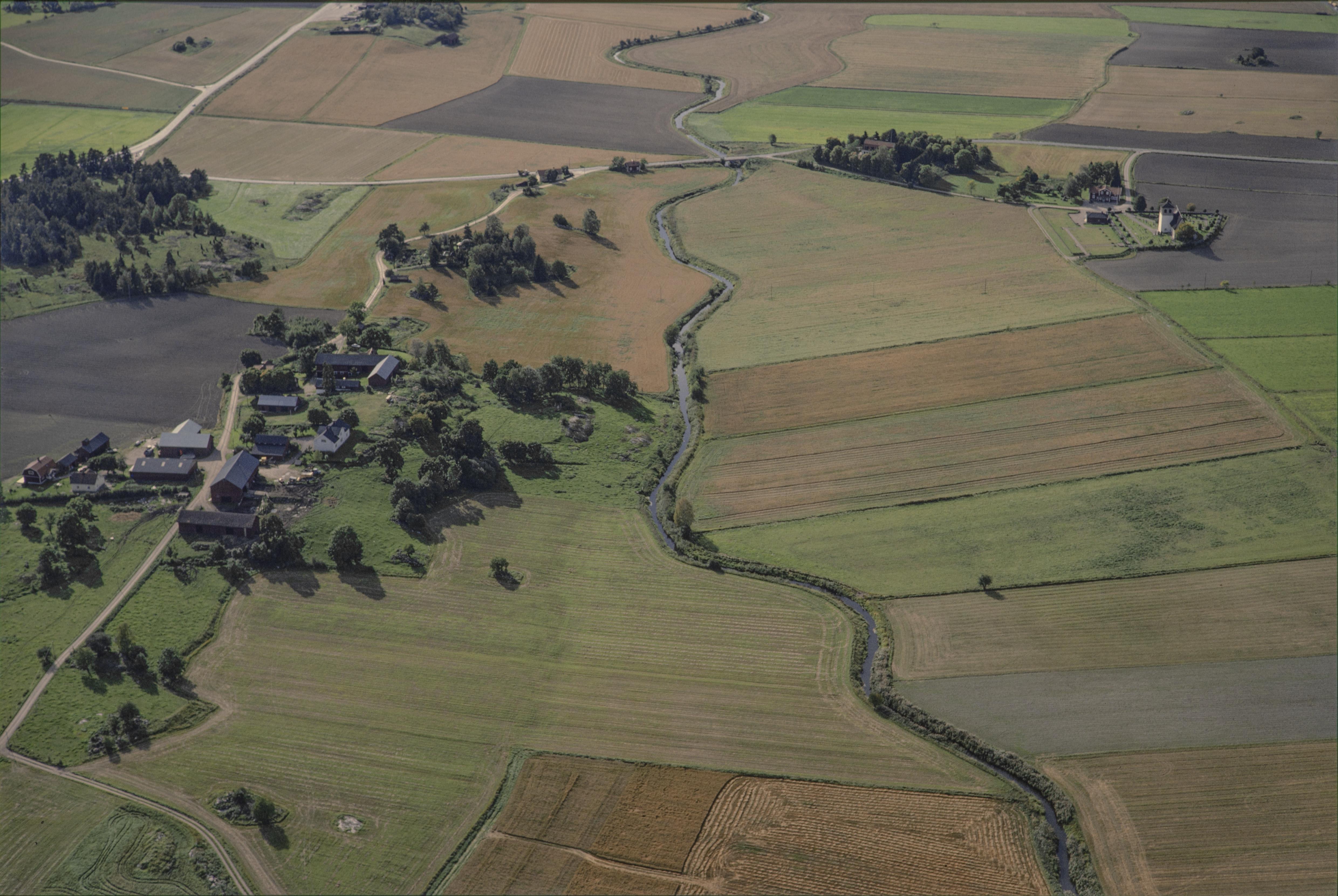 Beskrivning: Sätuna by vid Husbyån. Vid bildens mitt bytomt RAÄnr Husby-Sjuhundra 157:1. Uppe till höger Husby-Sjuhundra kyrka. Bilden är tagen mot (väderstreck): VSV