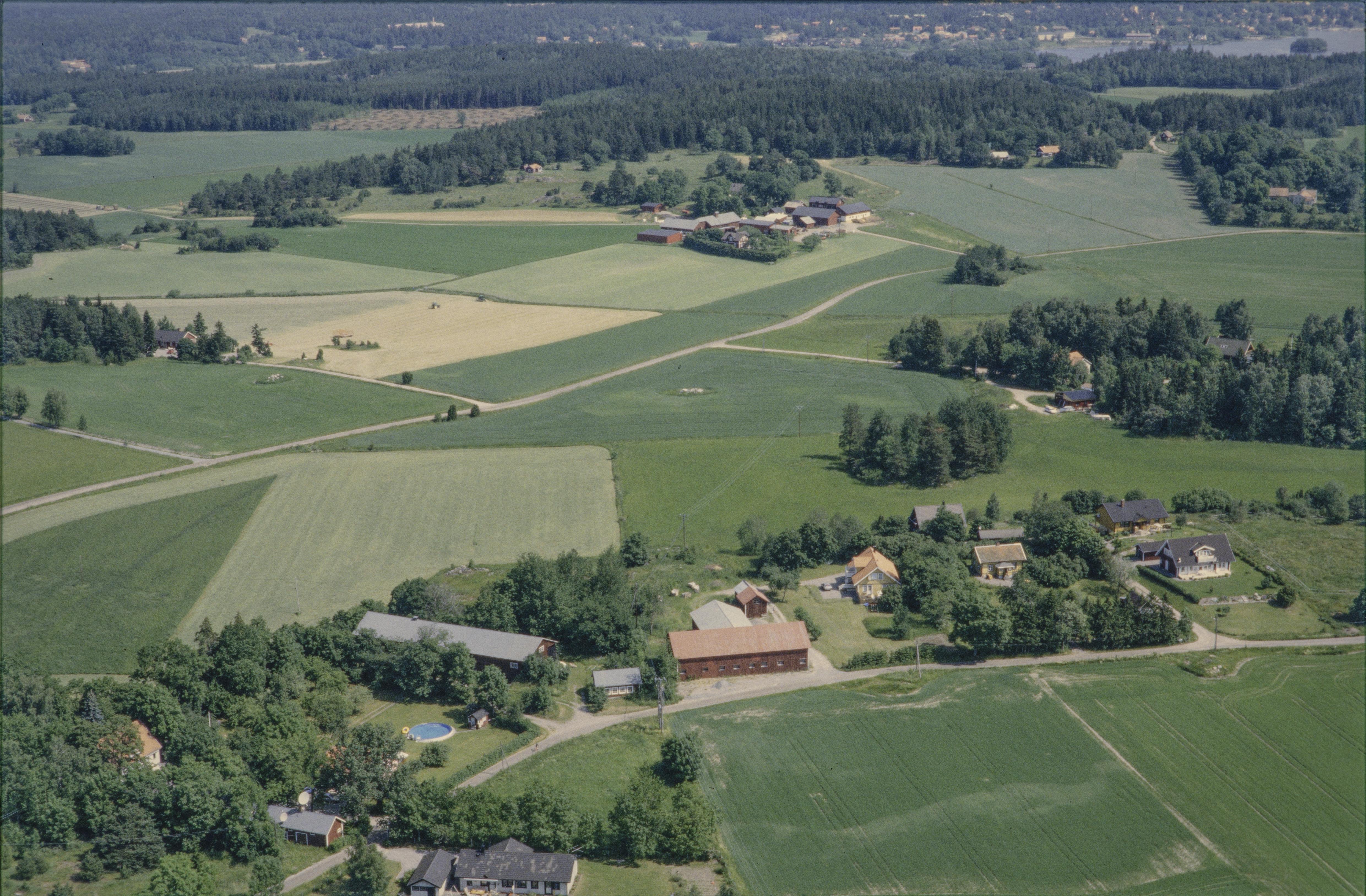 Beskrivning: Helgesta by. Nere till vänster gravfält RAÄnr Håbo-Tibble 32:1. Över bildens mitt Hållunda by. I bildens övre kant Sigtuna stad vid Sigtunafjärden i Mälaren. Bilden är tagen mot (väderstreck): NNO