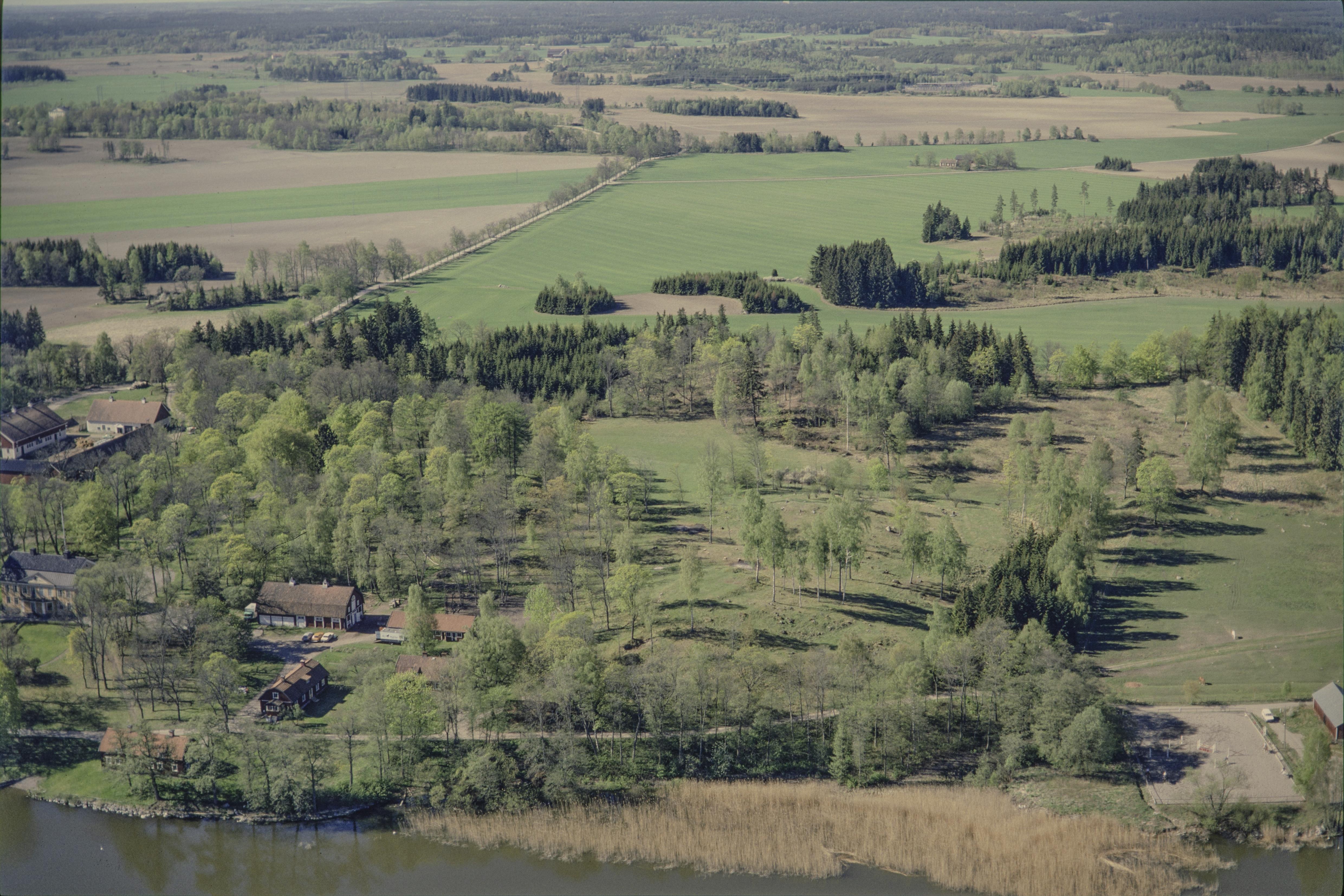 Beskrivning: Signhildsbergs kungsgård vid Håtunaviken i Mälaren. I området husgrund Fornsigtuna RAÄnr Håtuna 101:1. I bildens mitt tegelindustri Håtuna 122:1 och gravfält Håtuna 99:1 m.fl. Bilden är tagen mot (väderstreck): SV
