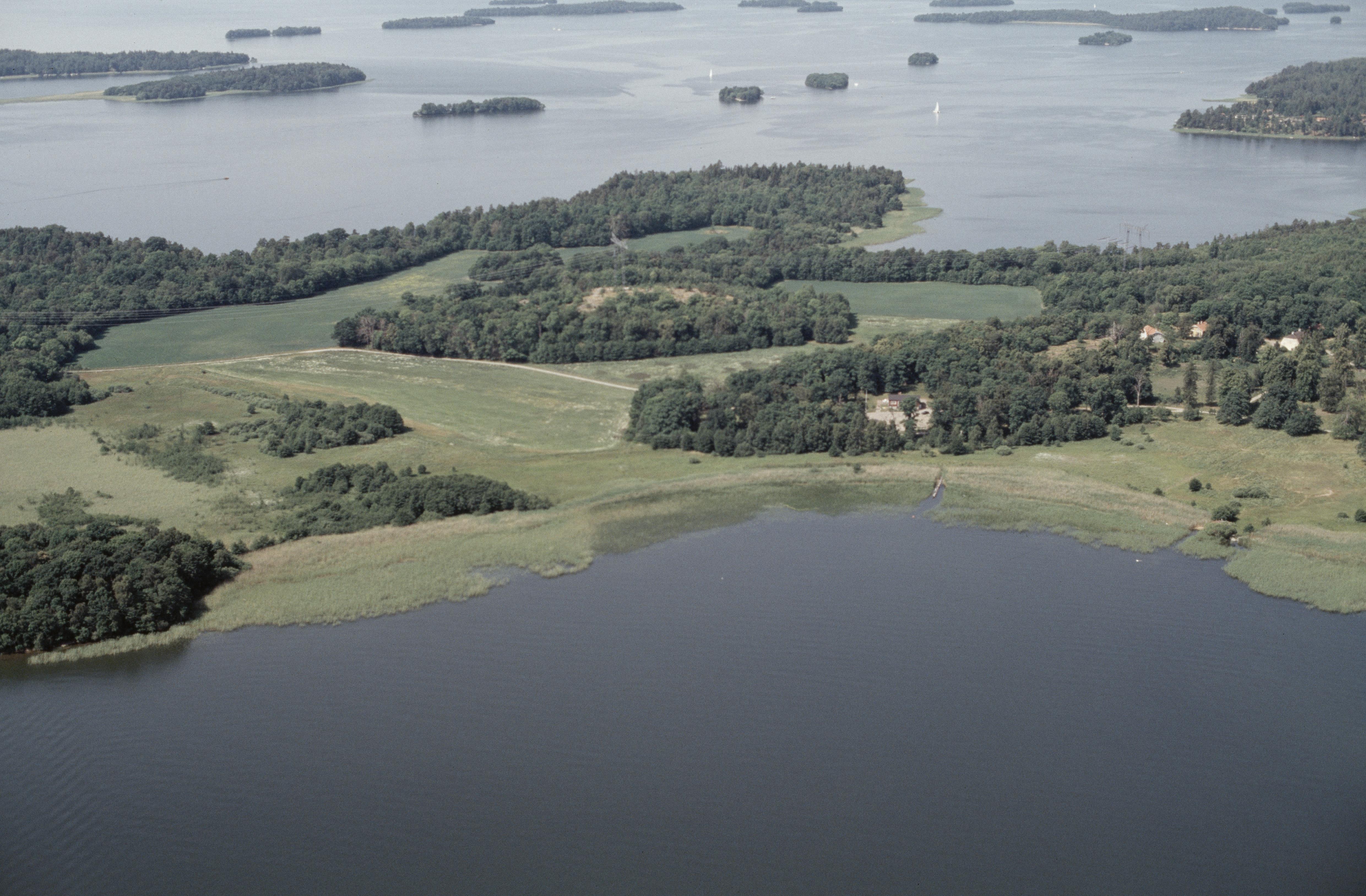 Beskrivning: Söder om Ådö herrgård på Lagnö mellan Brofjärden och Norra Björkfjärden i Mälaren. Vid bildens mitt grund av väderkvarn RAÄnr Låssa 54:1. Bilden är tagen mot (väderstreck): VNV