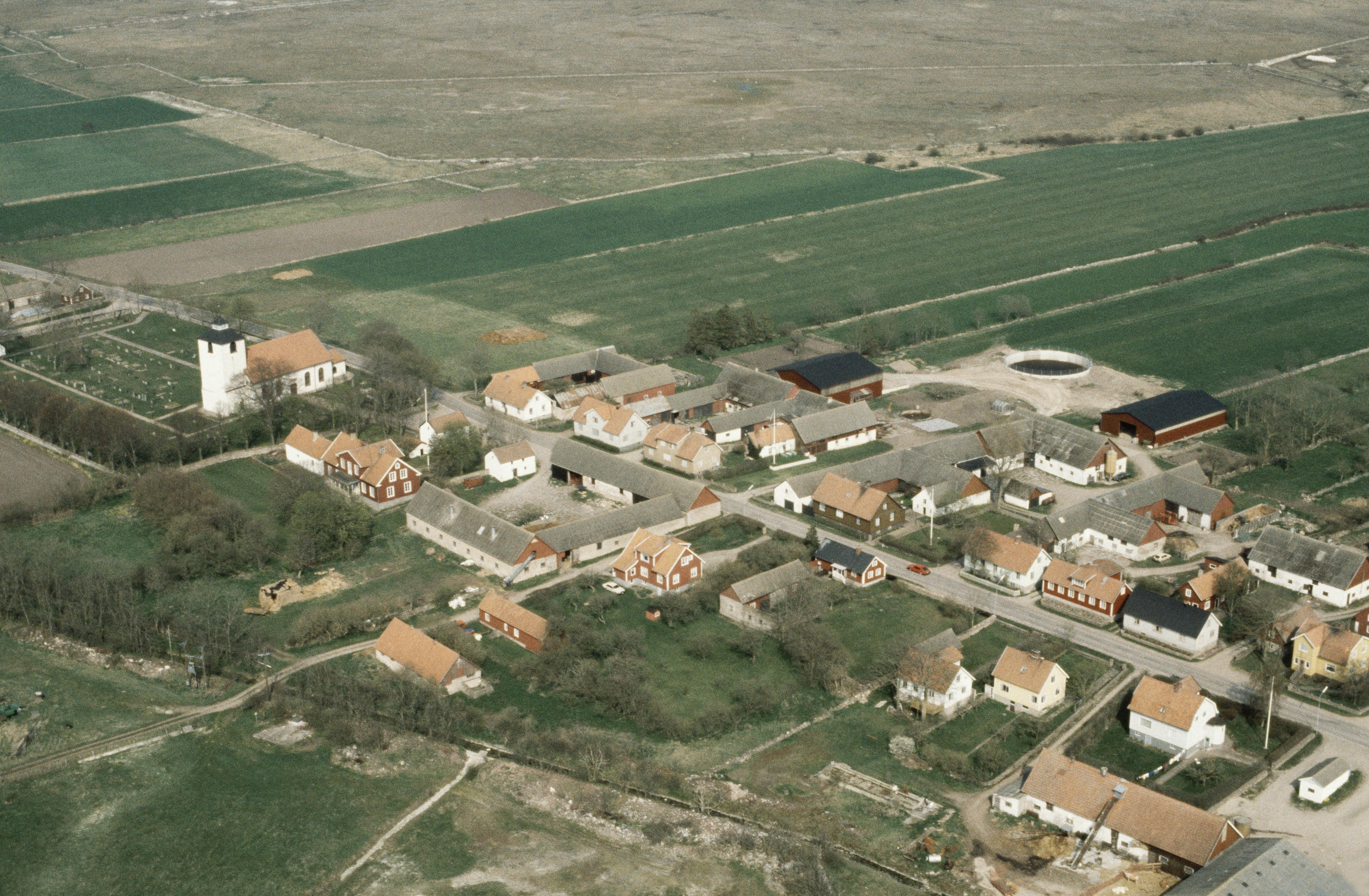 Beskrivning: Alvaret. Hulterstads kyrka och kyrkby. Bilden är tagen mot (väderstreck): NO