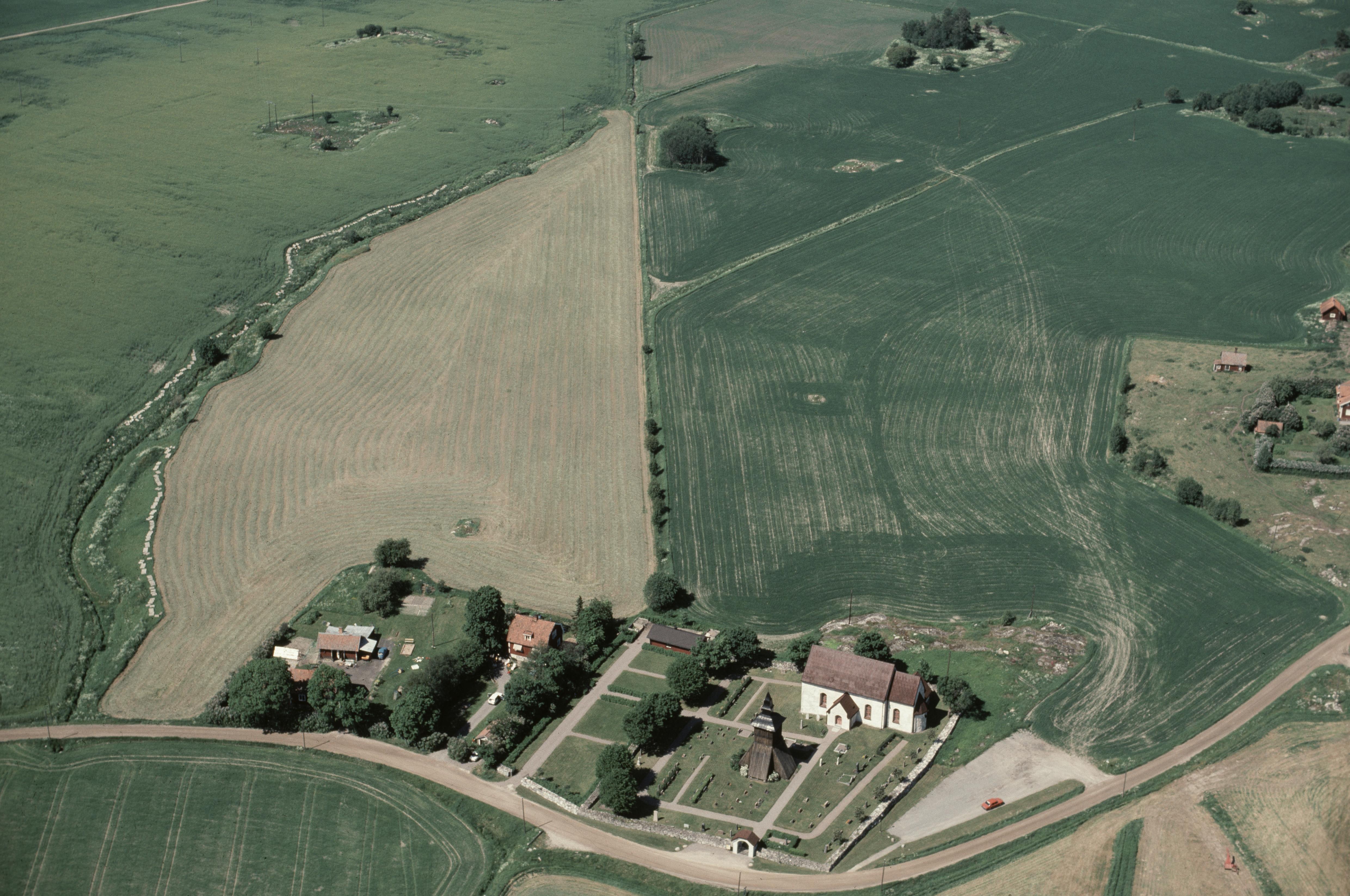 Beskrivning: Orkesta kyrka och kyrkby. Bilden är tagen mot (väderstreck): NNV