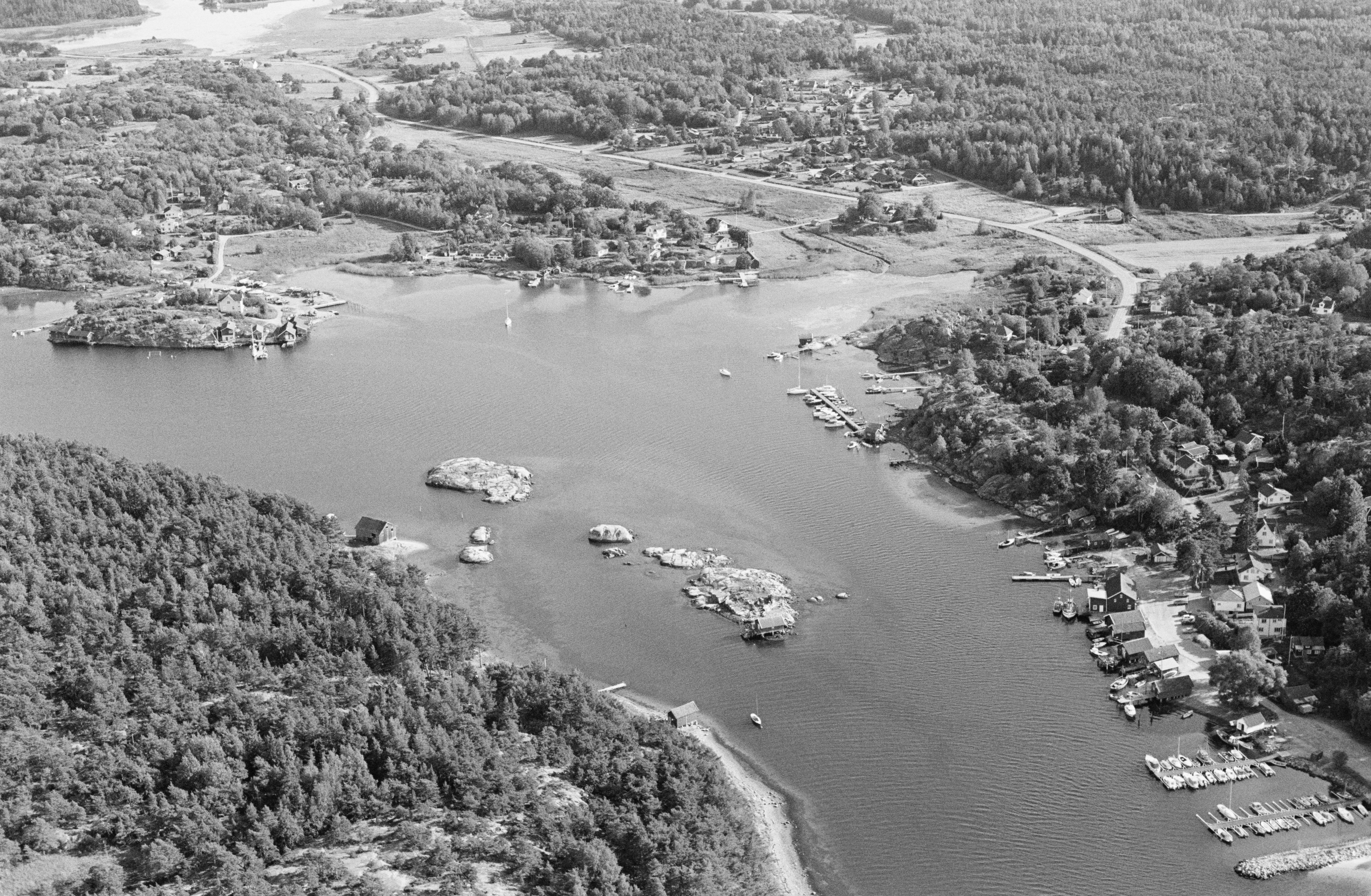 Beskrivning: Rossösundet. Nere till vänster Rundö och till höger Rossö (skrivs även Råssö). Vikarna by uppe till höger med bytomt RAÄnr Tjärnö 158:1. Bilden är tagen mot (väderstreck): SSO