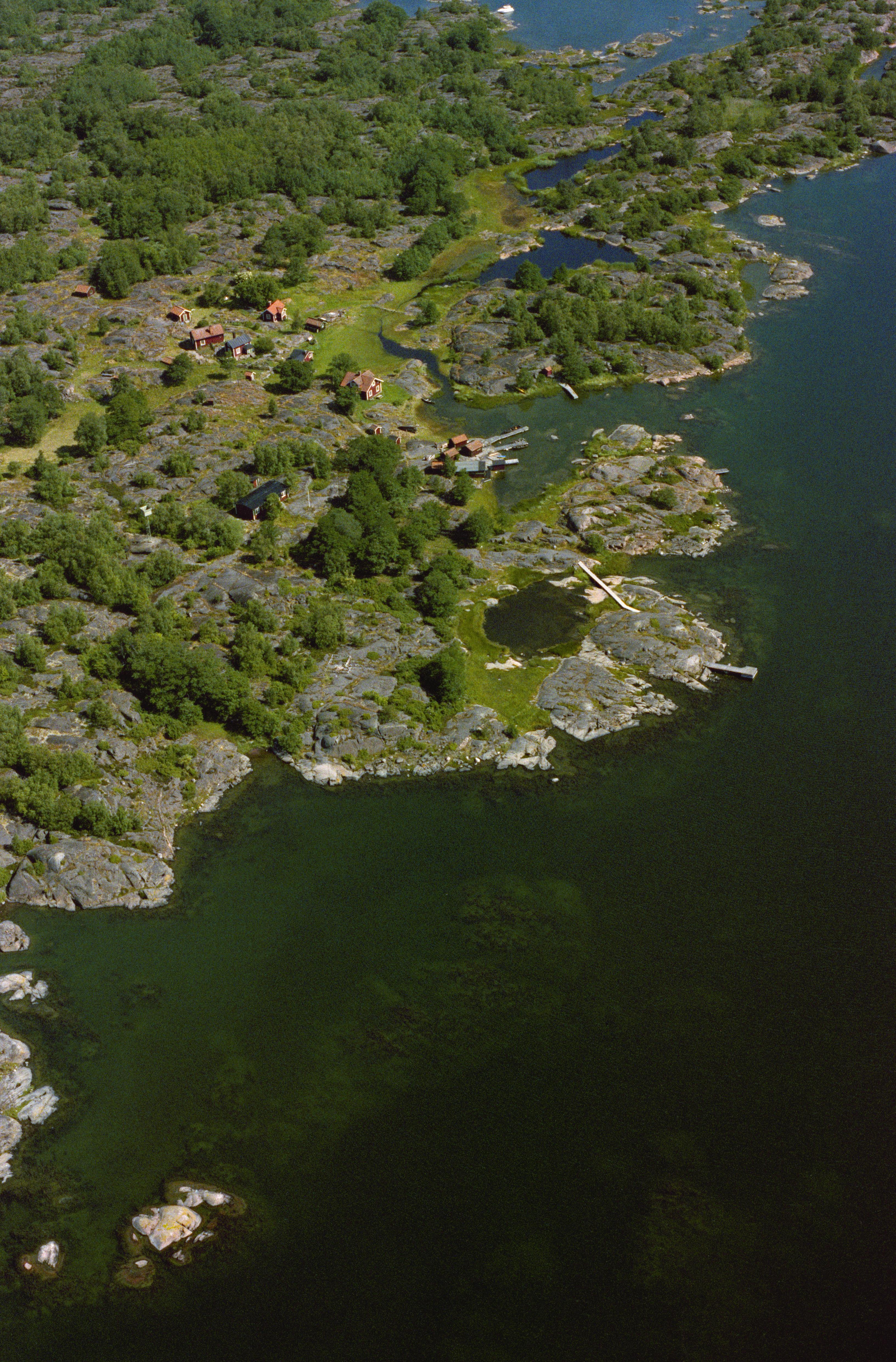 Beskrivning: Långviksskärs naturreservat i Nämndöfjärden. Ön Långviksskär med kringliggande öar och holmar. Vid bildens mitt Långviksskärs by vid Björkströmmen. I bildens övre del husgrund RAÄnr Nämdö 24:1. Bilden är tagen mot (väderstreck): NO