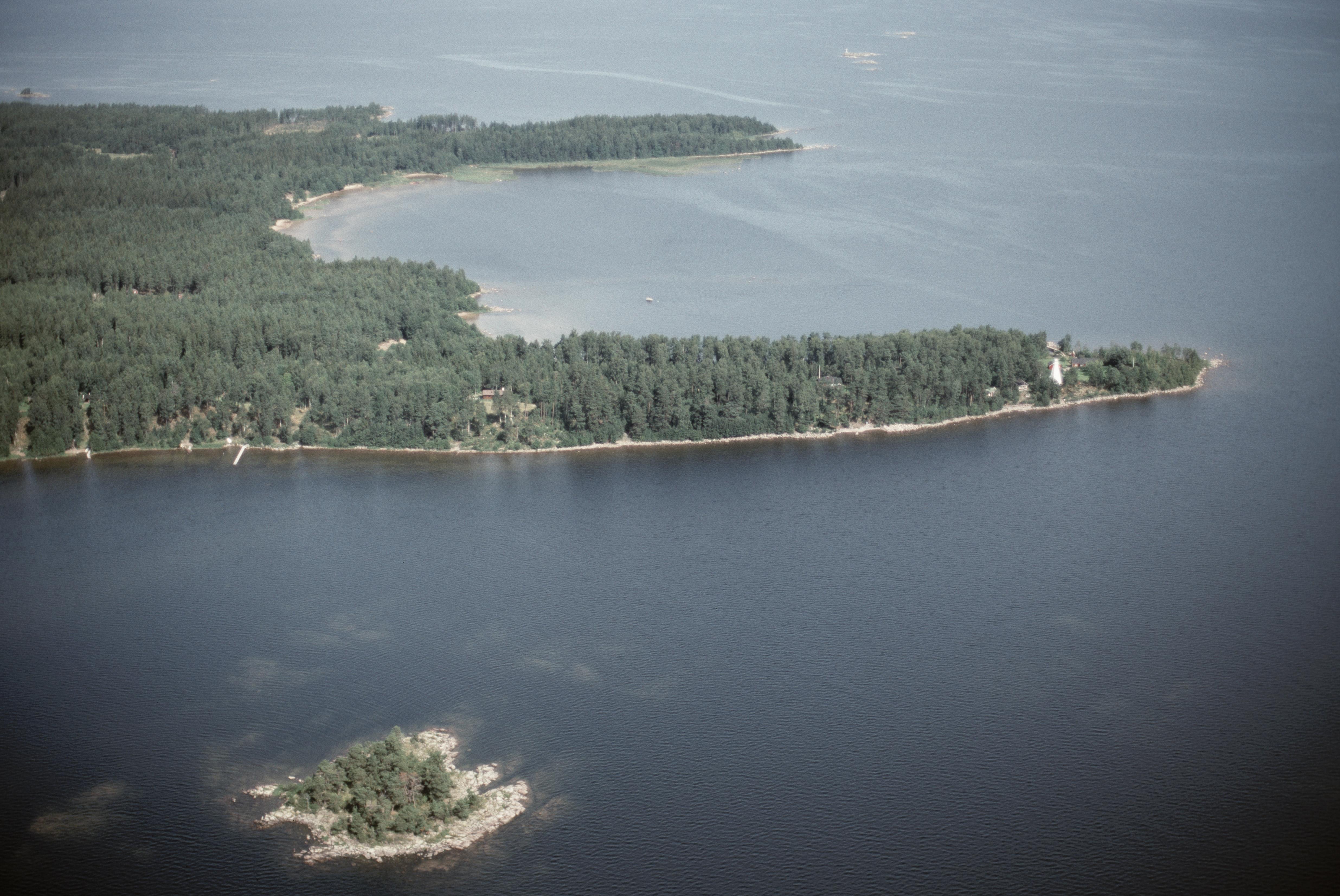 Beskrivning: Hjortens udde fyrplats i Dalbosjön. I bildens nedre del Flatskär. Bilden är tagen mot (väderstreck): NNO