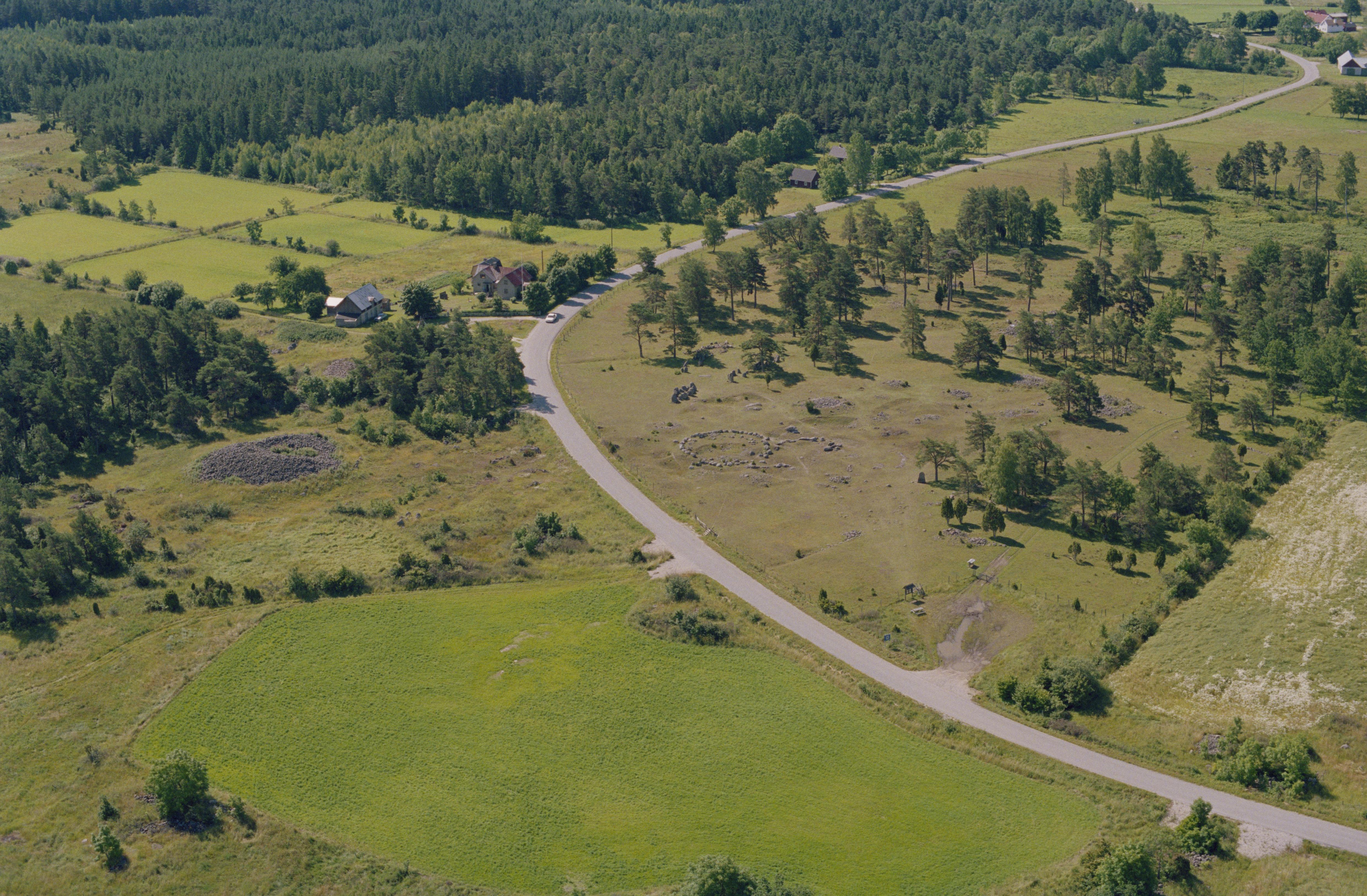 Beskrivning: På båda sidor av vägen Gålrums gravfält Alskog 9:1 med flera rösen och skeppssättningar m.m. Röset Digerrojr till vänster om bildens mitt. Guffride by uppe till höger. Bilden är tagen mot (väderstreck): S