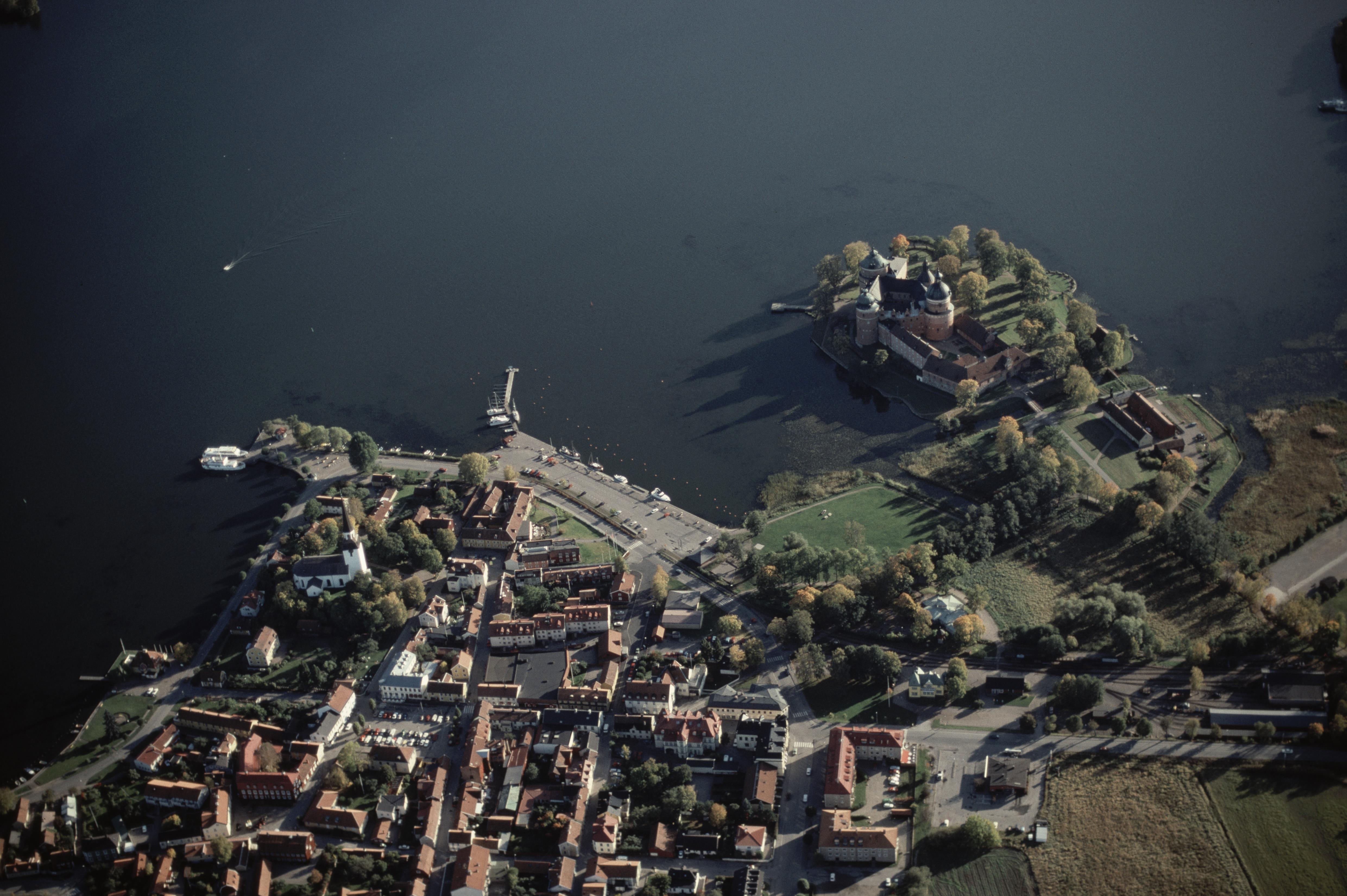 Beskrivning: Mariefreds stad vid gränsen till Kärnbo socken (i bildens högra del). Mariefreds kyrka till vänster. Gripsholms slott uppe till höger. Bilden är tagen mot (väderstreck): SV
