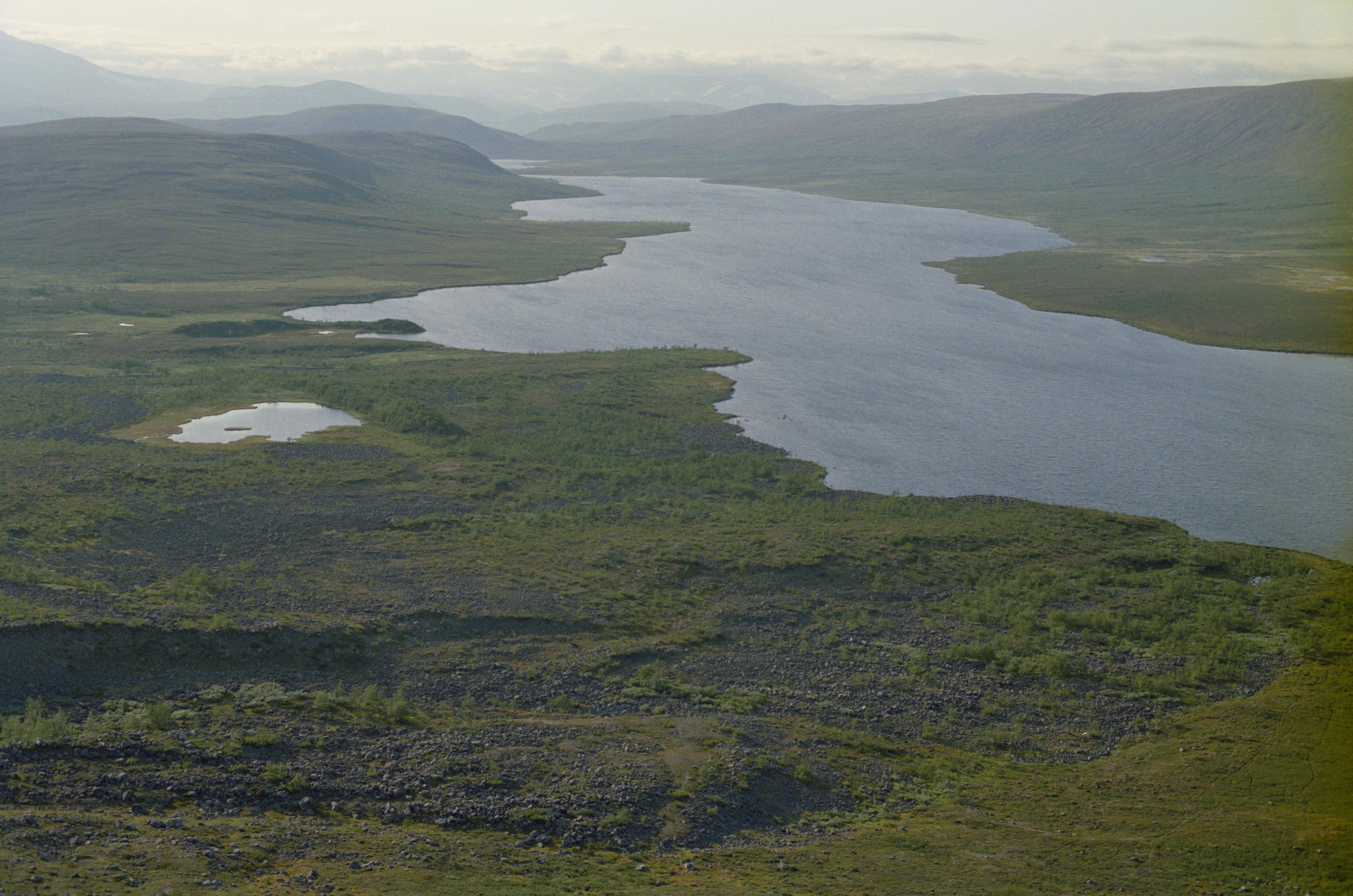 Beskrivning: Sjön Kiepanjaure (Giehpanjávri / Kiehpanjärvi). I bildens nedre del södra stranden i området under berget Giehpanvárri. Till vänster om bildens mitt sjön Darfaljaure (Darfáljávri) och till vänster i bildens övre del berget Darfál i nordvästra ändan av sjön. Bilden är tagen mot (väderstreck): NV