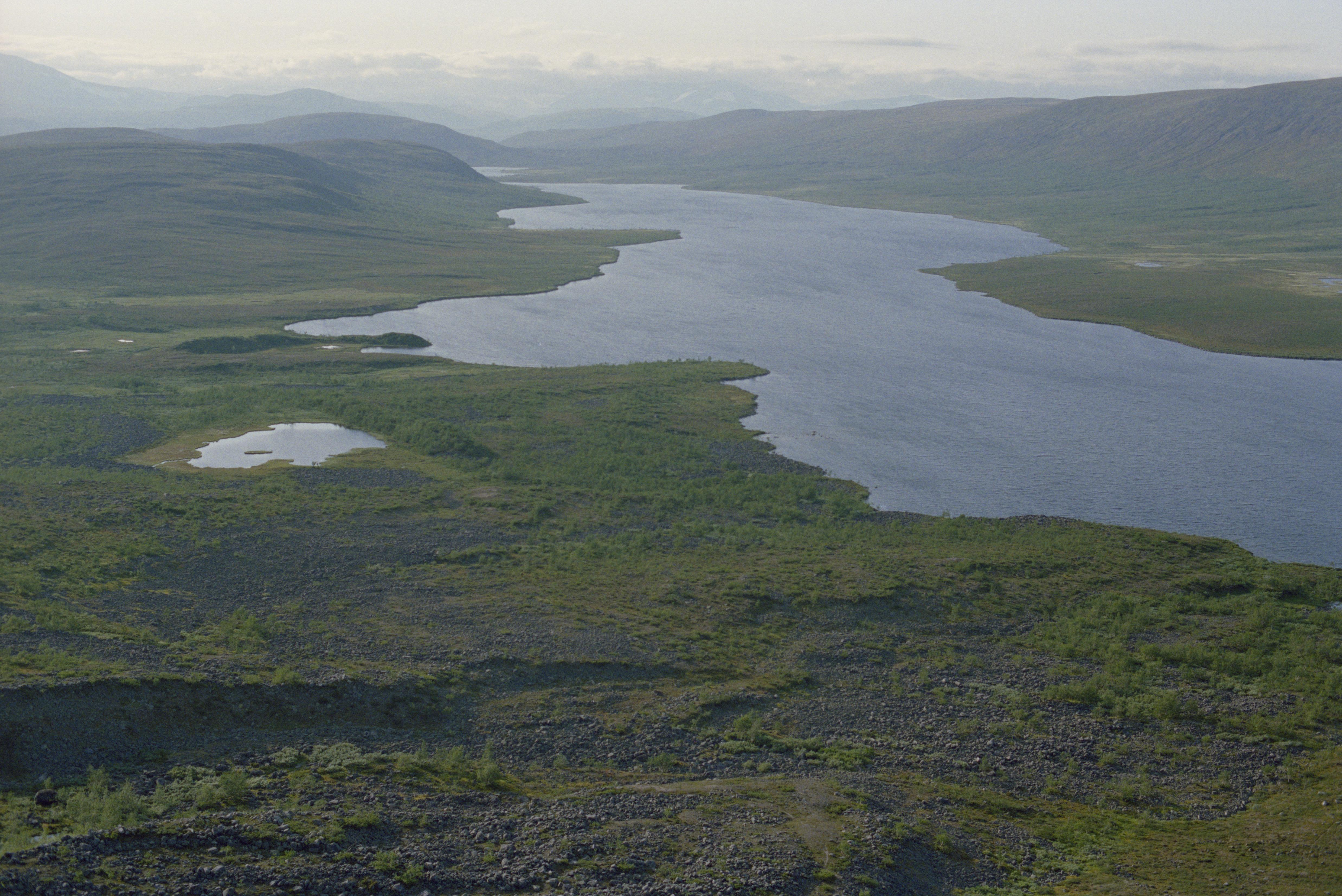 Beskrivning: Sjön Kiepanjaure (Giehpanjávri / Kiehpanjärvi). I bildens nedre del södra stranden i området under berget Giehpanvárri. Till vänster om bildens mitt sjön Darfaljaure (Darfáljávri) och till vänster i bildens övre del berget Darfál i nordvästra ändan av sjön. Bilden är tagen mot (väderstreck): NV