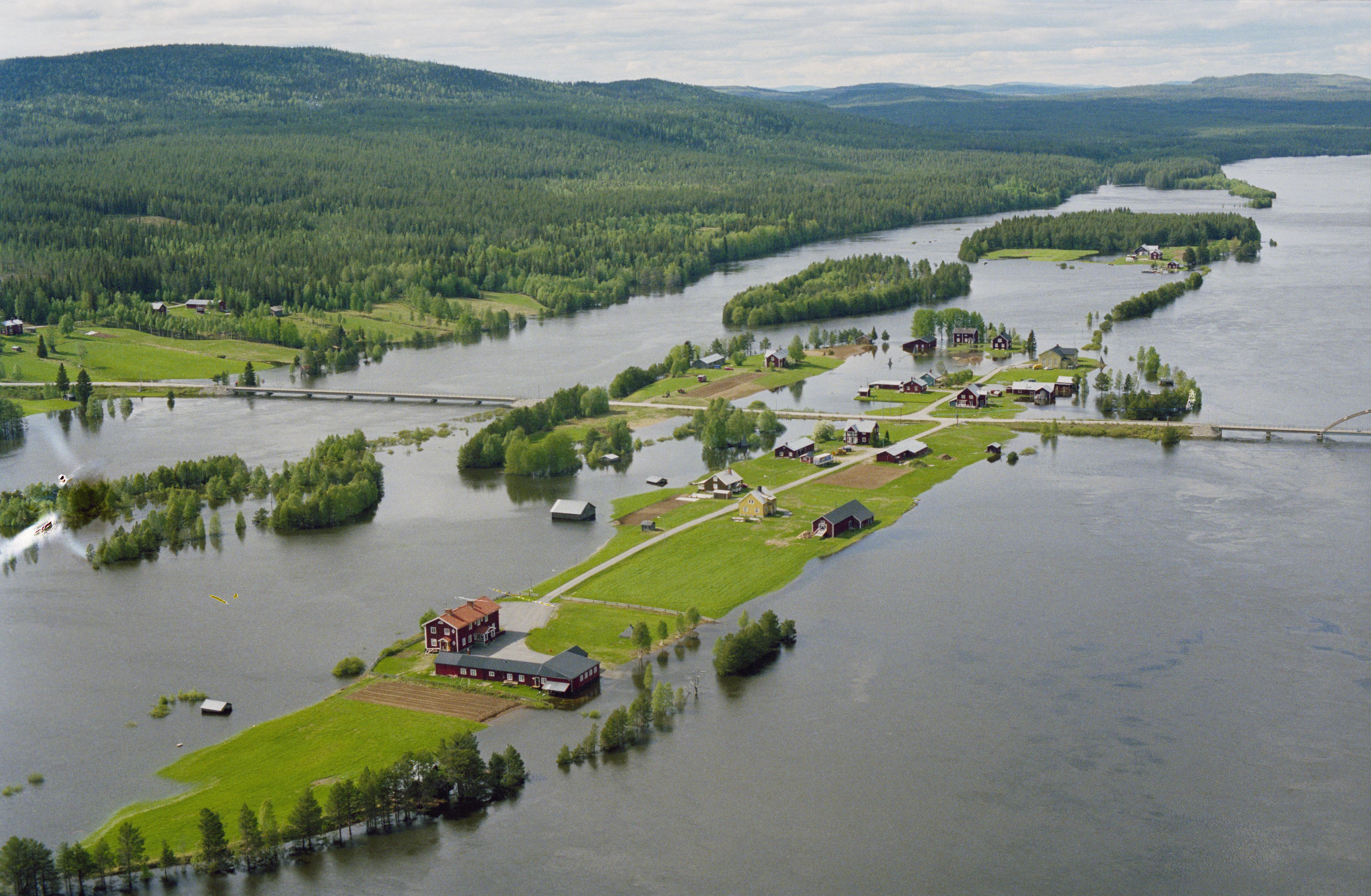 Beskrivning: Vindelälven (Vidduoljiennuo) vid Vindelgransele by (Krániesuvvane). På Brännholmen (mellan broarna vid bildens mitt) ett sameviste RAÄnr Lycksele 1526:1. Området är här delvis översvämmat efter vårfloden. Bilden är tagen mot (väderstreck): NV