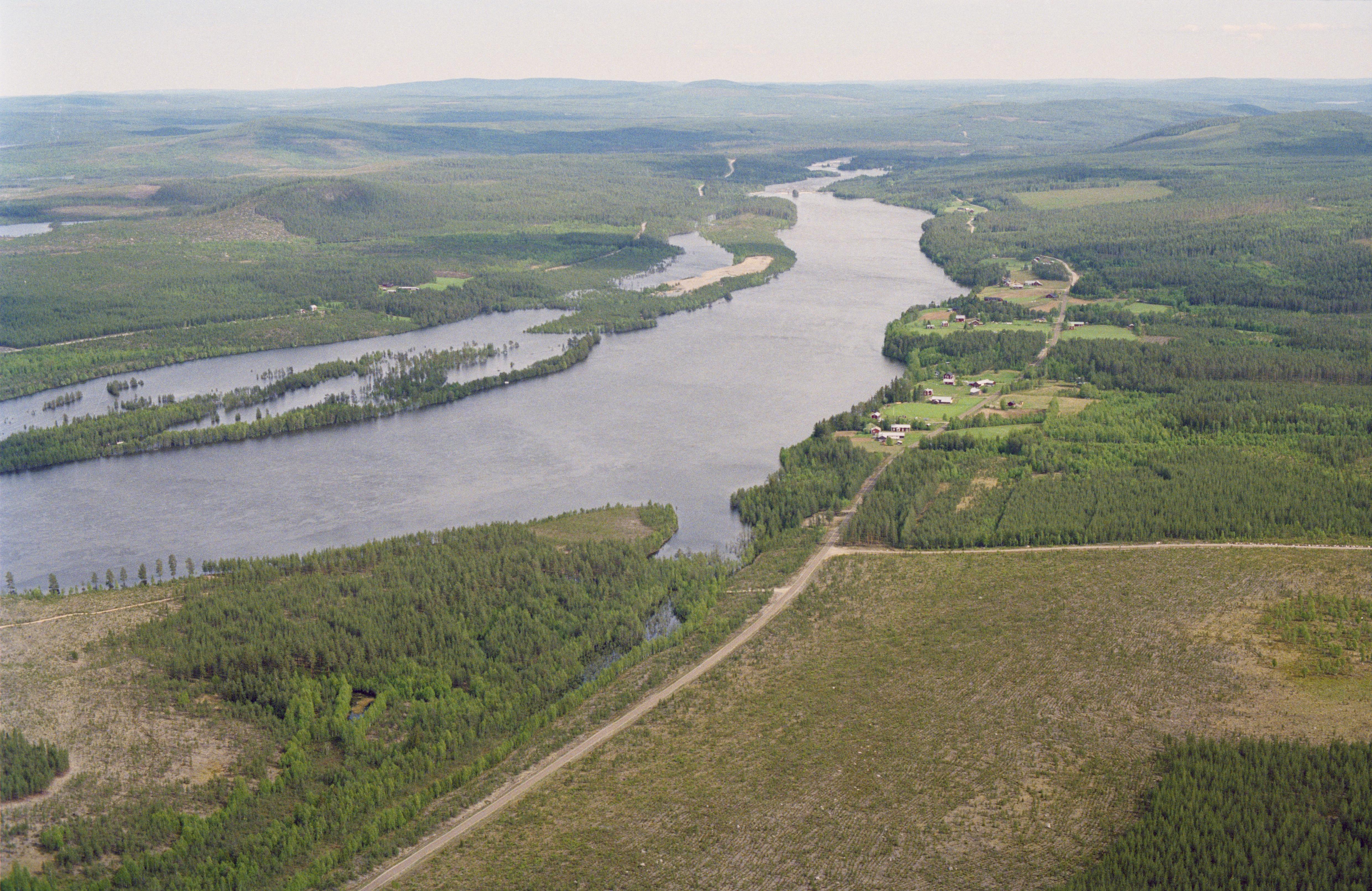 Beskrivning: Siksele by vid Vindelälven (Vidduoljiennuo). Vid älvkanten uppe till vänster boplats RAÄnr Lycksele 295:1, 296:1 m.fl. söder om Mastakluddens naturreservat. I bildens övre del Sikseleforsen i Degerfors socken, landskapet Västerbotten. Bilden är tagen mot (väderstreck): OSO