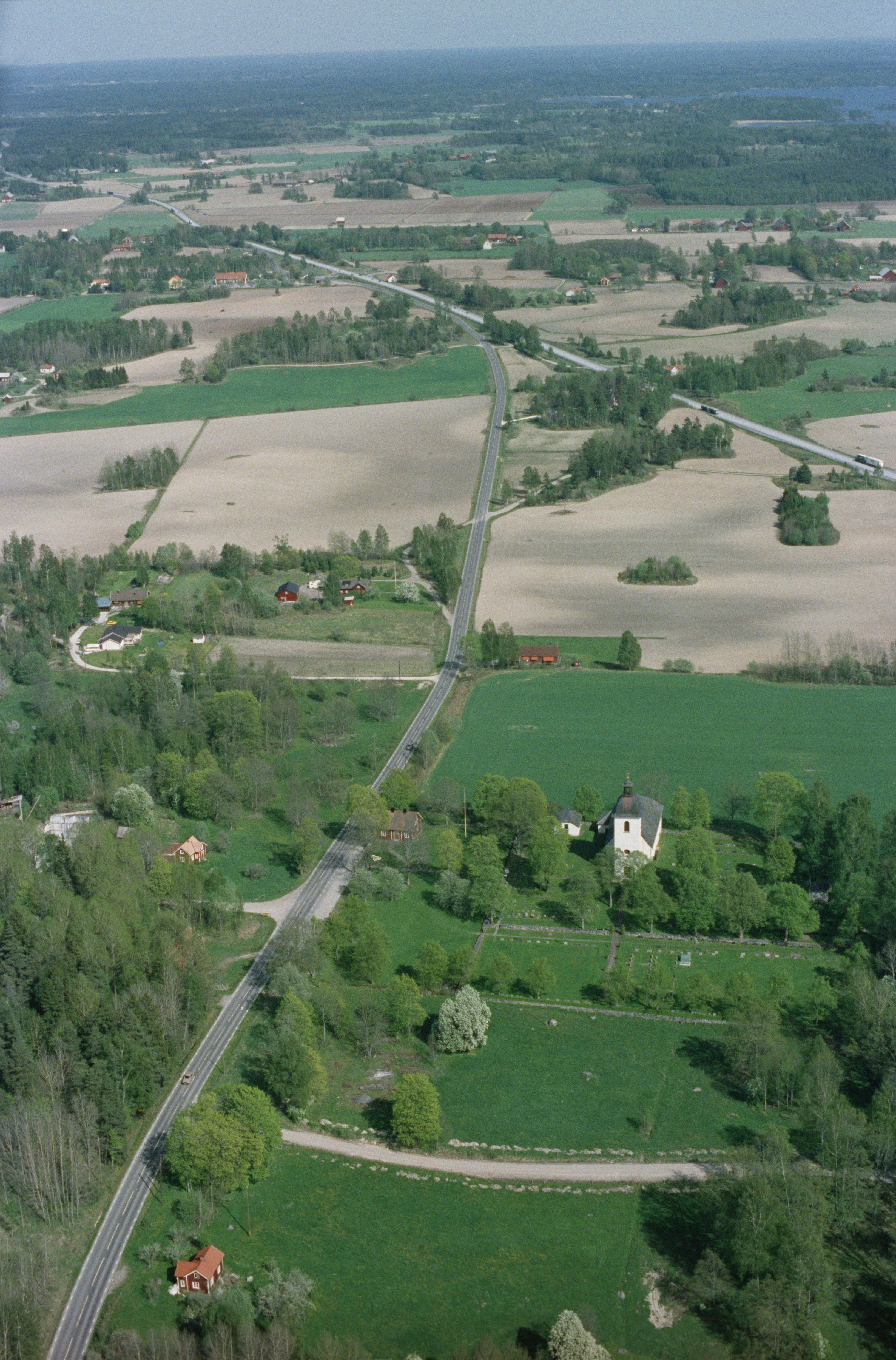 Beskrivning: Väg E18 (gamla och nya) vid Lillkyrka kyrka. Bilden är tagen mot (väderstreck): Ö
