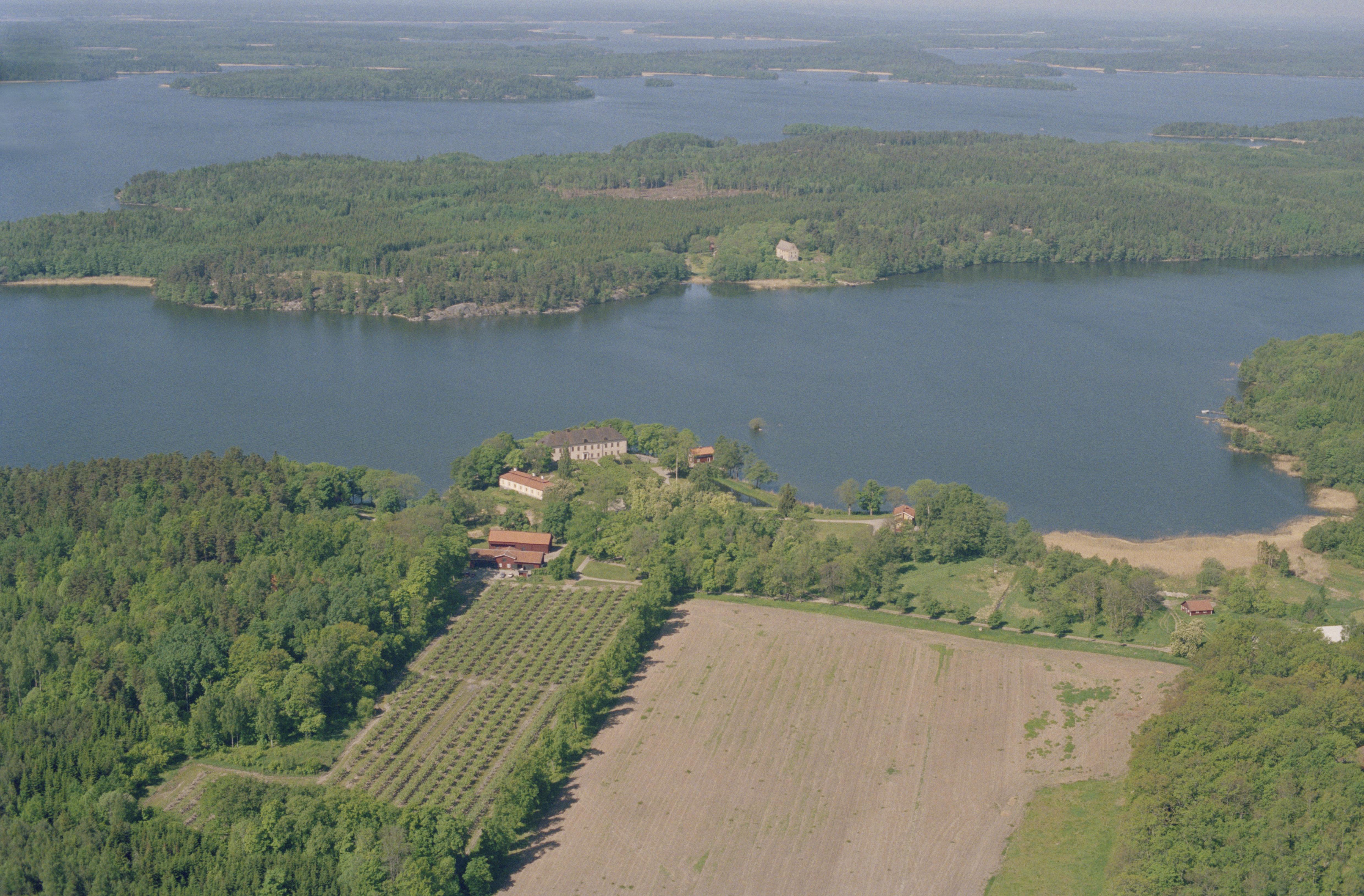 Beskrivning: Grönsö slott (äldre stavning Grönsöö slott), byggnadsminne RAÄnr Kungs-Husby 89:1, vid Grönsösundet i Mälaren. I bildens övre del statligt byggnadsminne Utö hus RAÄnr Kungs-Husby 70:1 på Arnö. Bilden är tagen mot (väderstreck): V