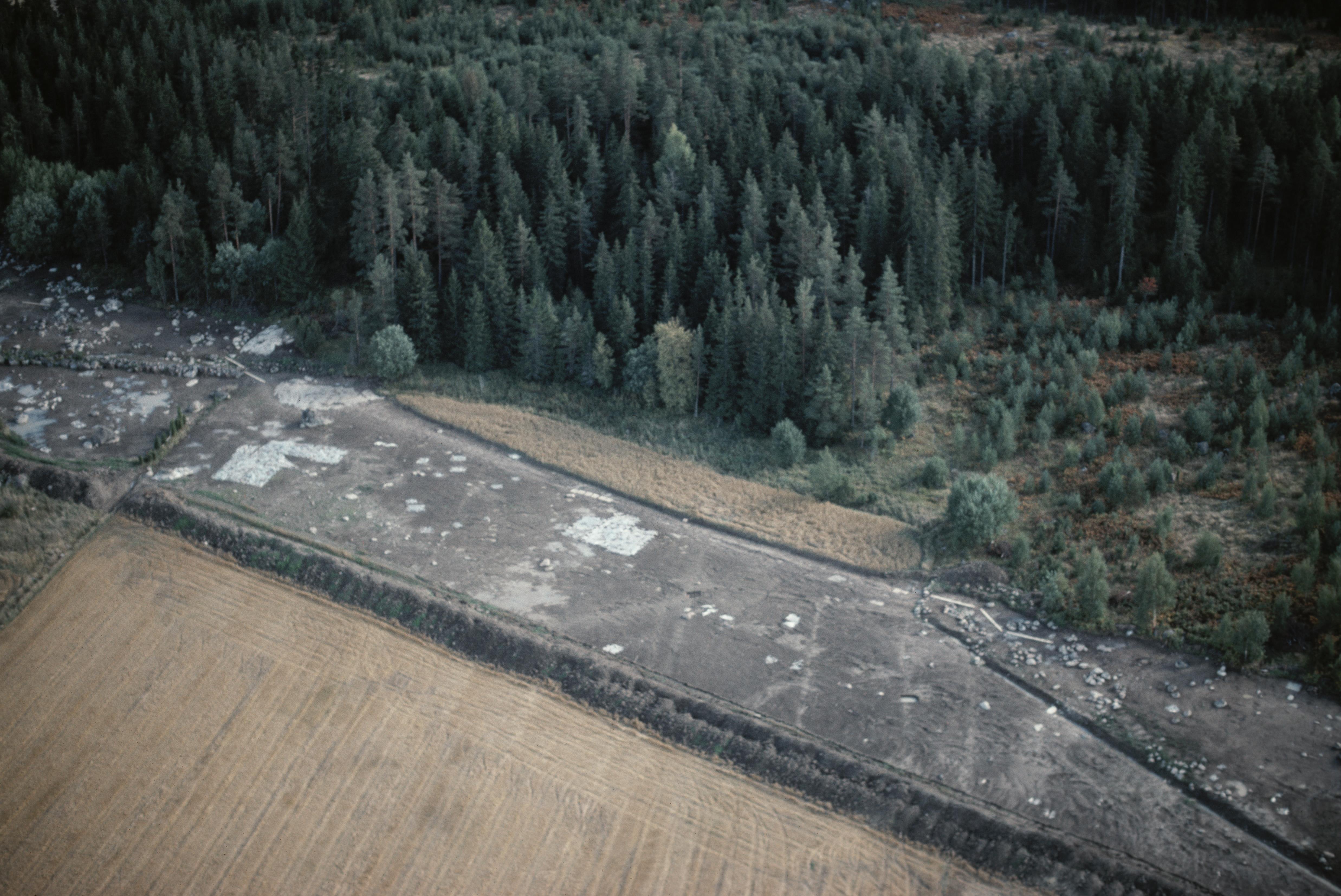 Beskrivning: Arkeologiska undersökningar i samband med bygge av väg E18 genom fornlämningsområden i och vid Fiskvik, Knoppbacka, Skäggesta m.m. Vid bildens mitt grav- och boplats RAÄnr Litslena 561:1-2. Bilden är tagen mot (väderstreck): SSO