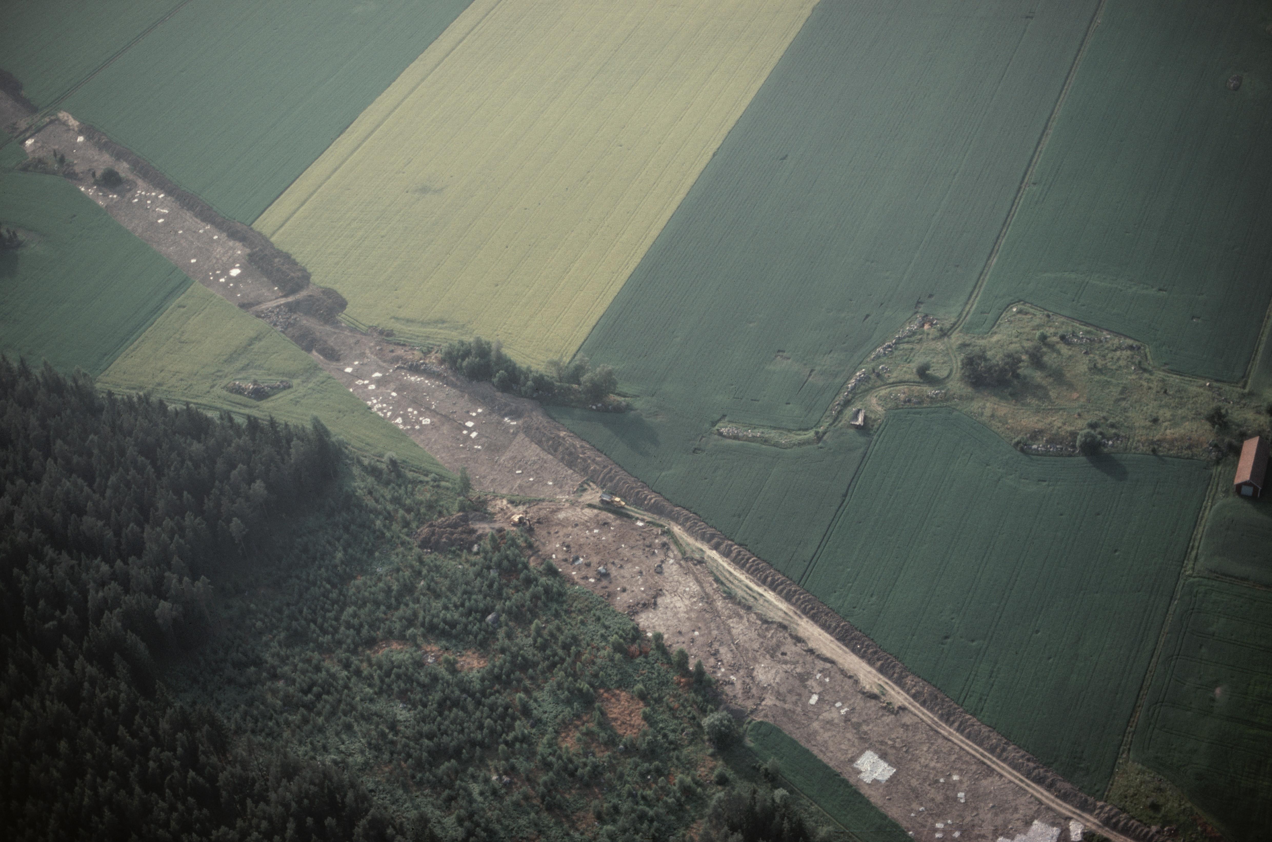 Beskrivning: Arkeologiska undersökningar i samband med bygge av väg E18 genom fornlämningsområden i och vid Fiskvik, Knoppbacka, Skäggesta m.m. Vid bildens mitt grav- och boplats RAÄnr Litslena 561:1-2 och hällristning Litslena 191:1. Bilden är tagen mot (väderstreck): NV