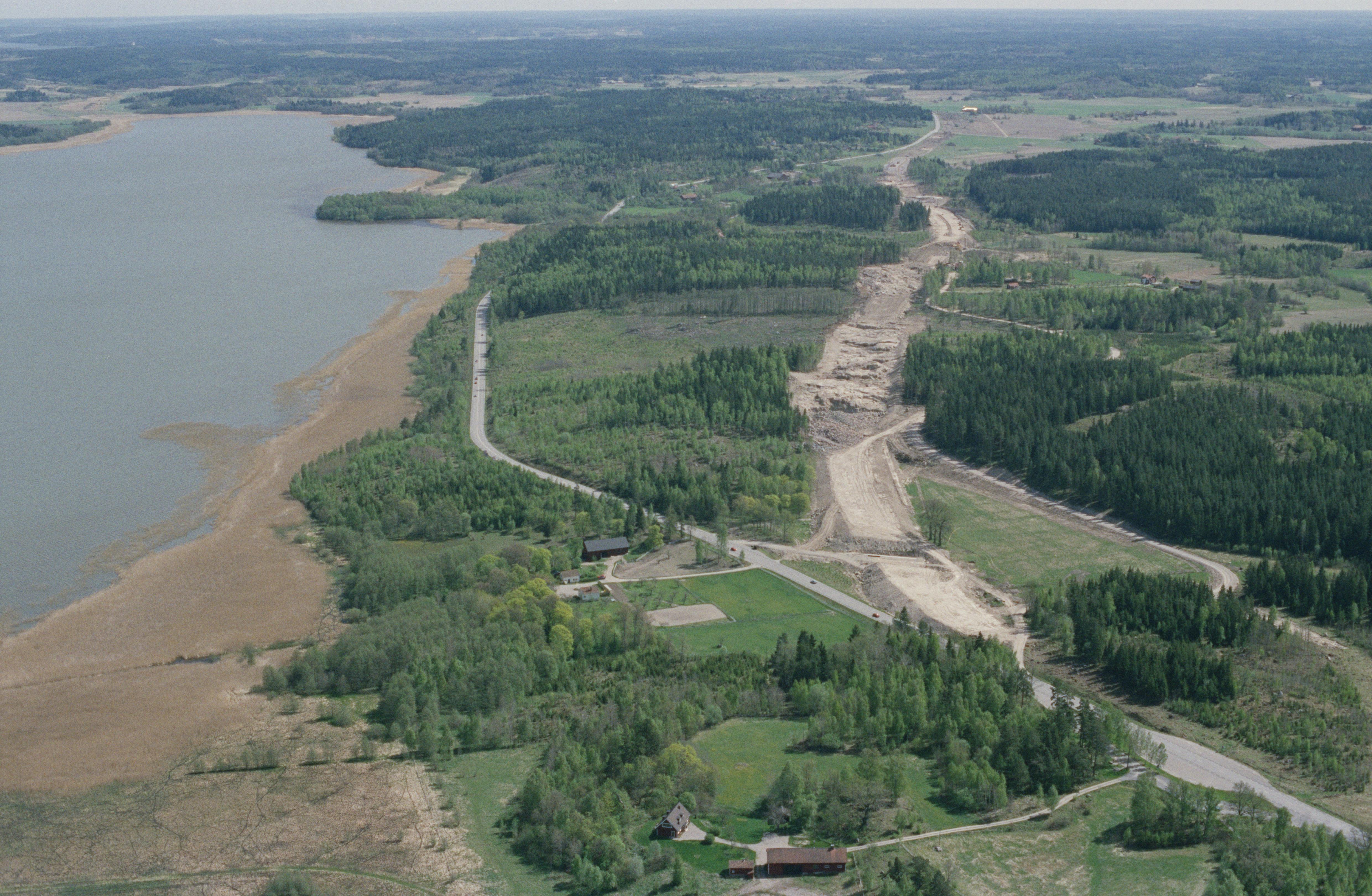 Beskrivning: Nere till vänster Fagerviks gård och färdväg RAÄnr Barva 126:1-2. Vid bildens mitt gränsen mot socknet Härad. Över bildens mitt arkeologiska undersökningar innan vägbygge av E3 / E20 i området söder om Sörfjärden i Mälaren. Bilden är tagen mot (väderstreck): Ö