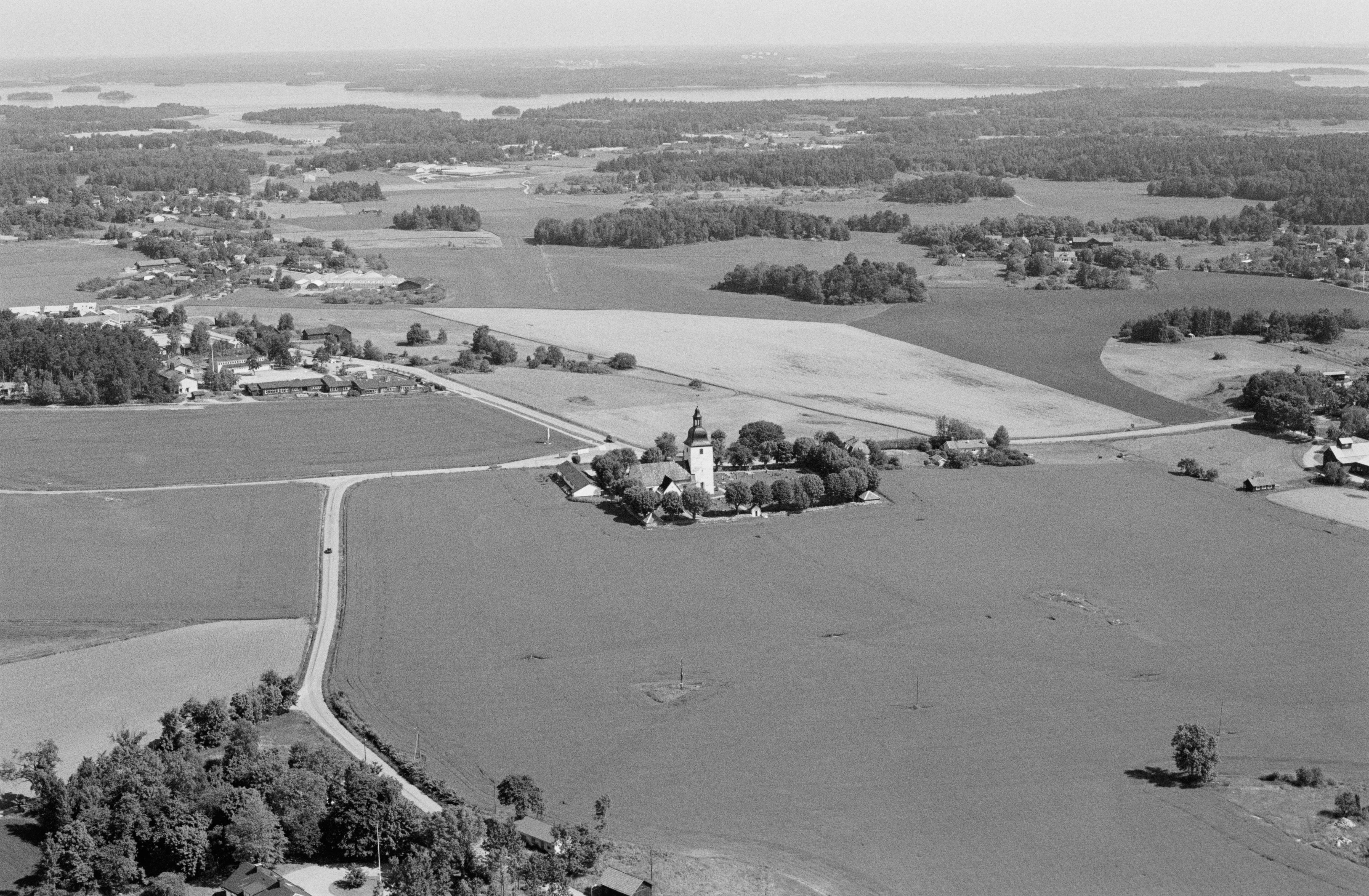 Beskrivning: Färingsö i Mälaren. Vid bildens mitt Färentuna kyrka. Bilden är tagen mot (väderstreck): NNO