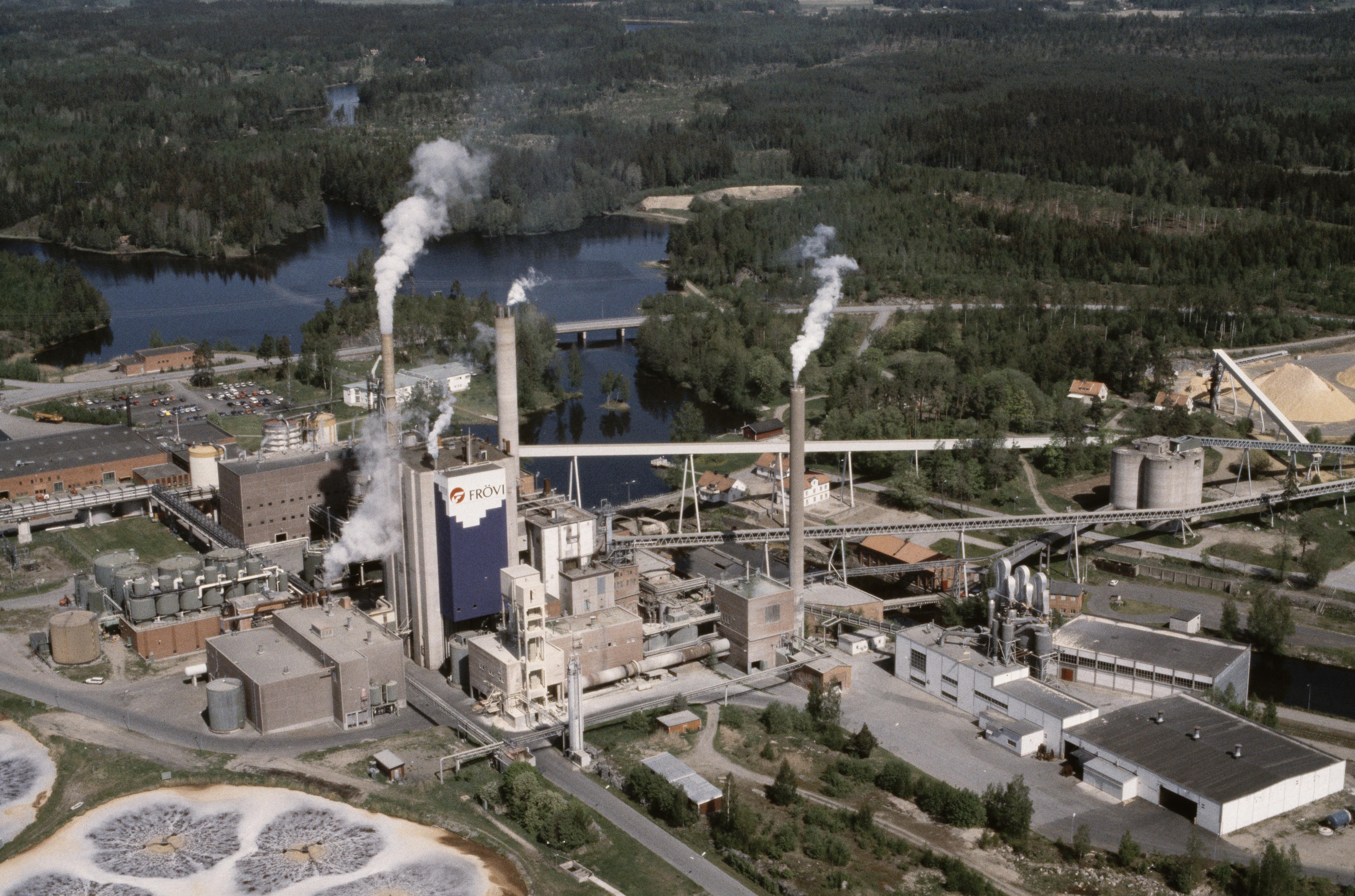 Beskrivning: Frövifors pappersbruk i Fröviåns dalgång. Reningsbassäng nere till vänster. Frövifors herrgård till höger om bildens mitt. I området fornminnen träindustri RAÄnr Näsby 123, hammarområde Näsby 121, kvarn Näsby 122 m.fl. Bilden är tagen mot (väderstreck): N