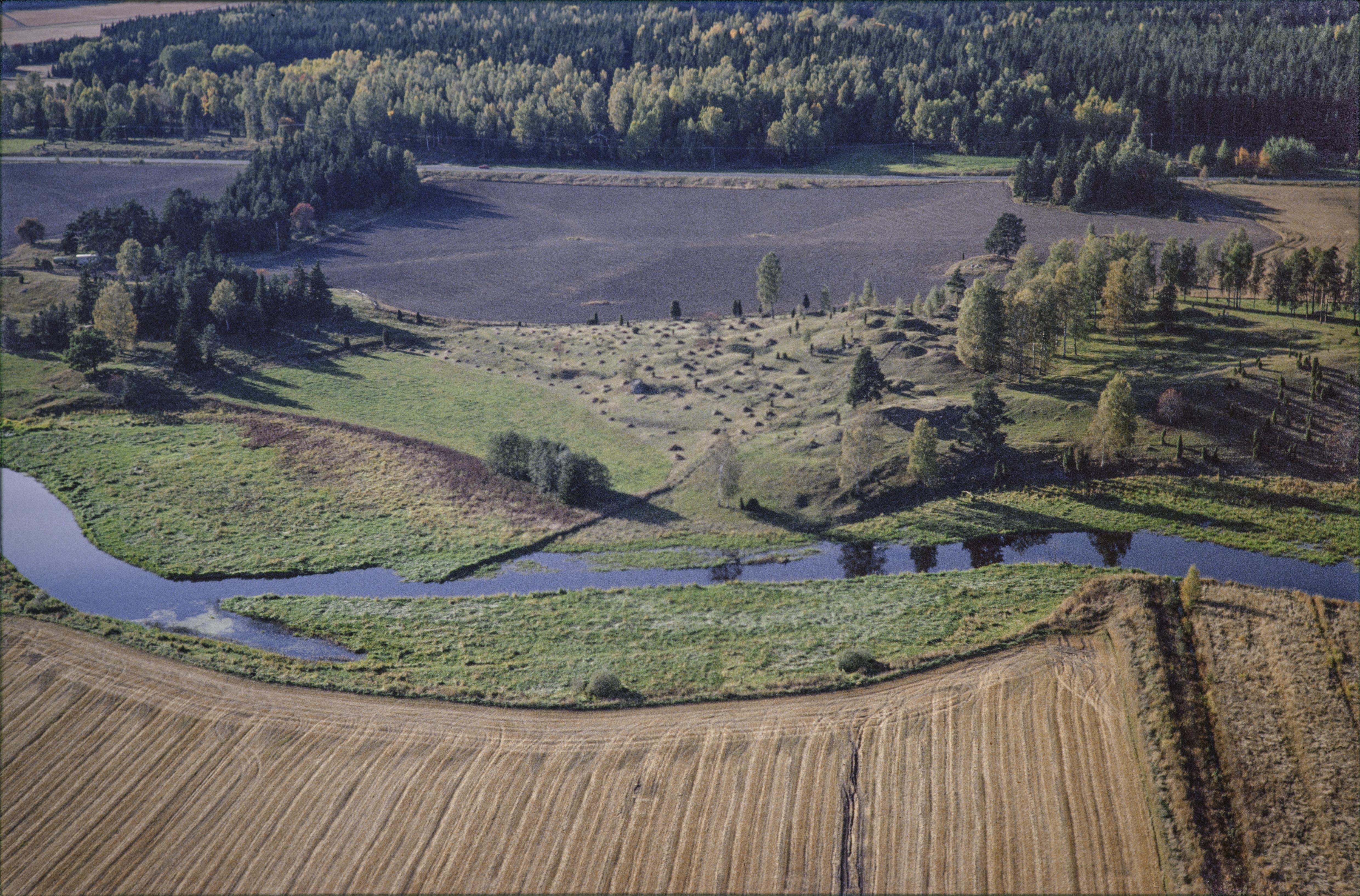 Beskrivning: Fyrisån vid Ekeby i Lena. Vid bildens mitt gravfält RAÄnr Lena 109:1 med husgrund Lena 380, bytomt Lena 575 och 835 m.fl. Bilden är tagen mot (väderstreck): V