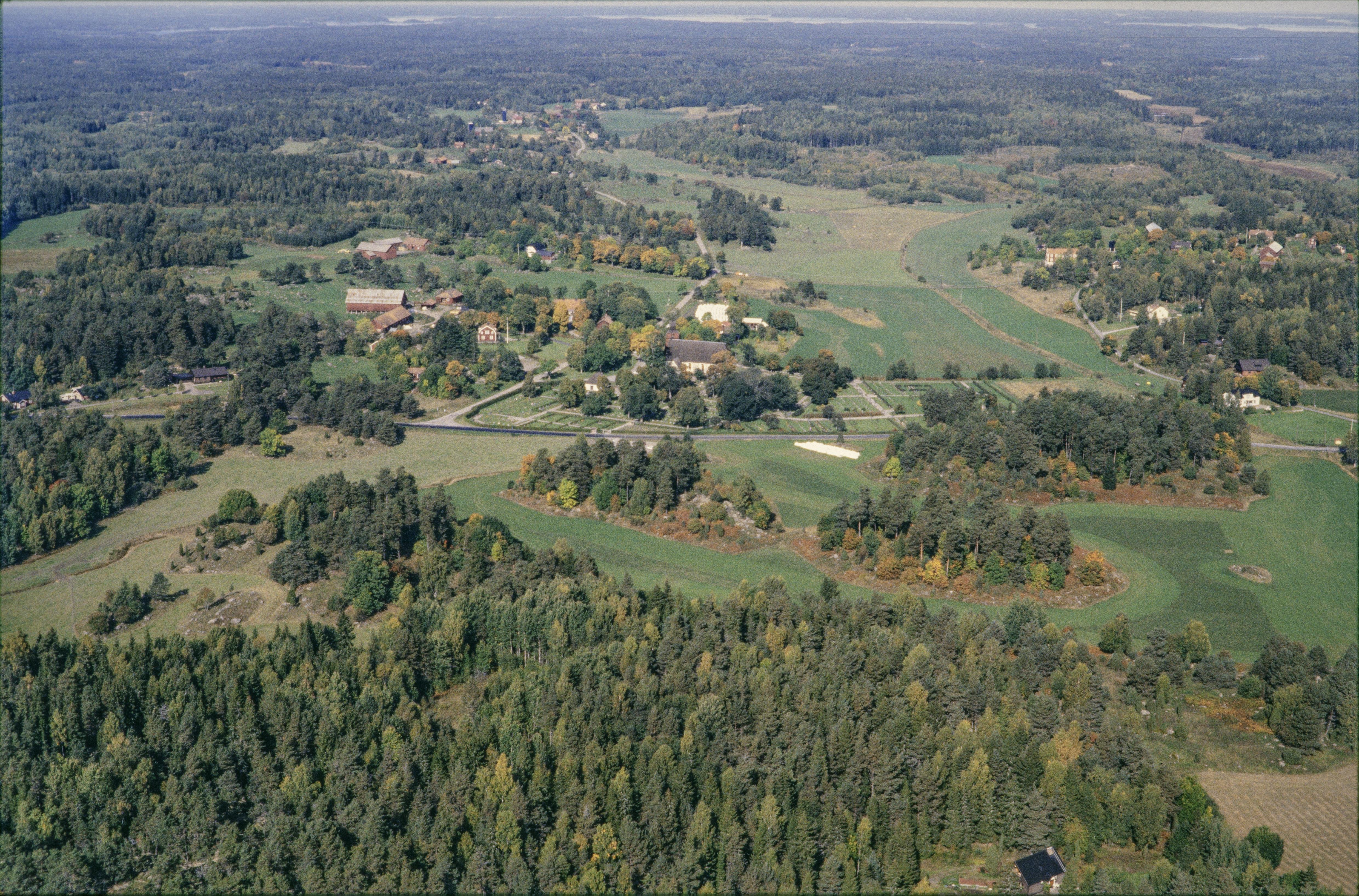 Beskrivning: Häverö kyrka och kyrkby över bildens mitt. Stensättning RAÄnr Häverö 30:1 under bildens mitt. Bilden är tagen mot (väderstreck): NNV