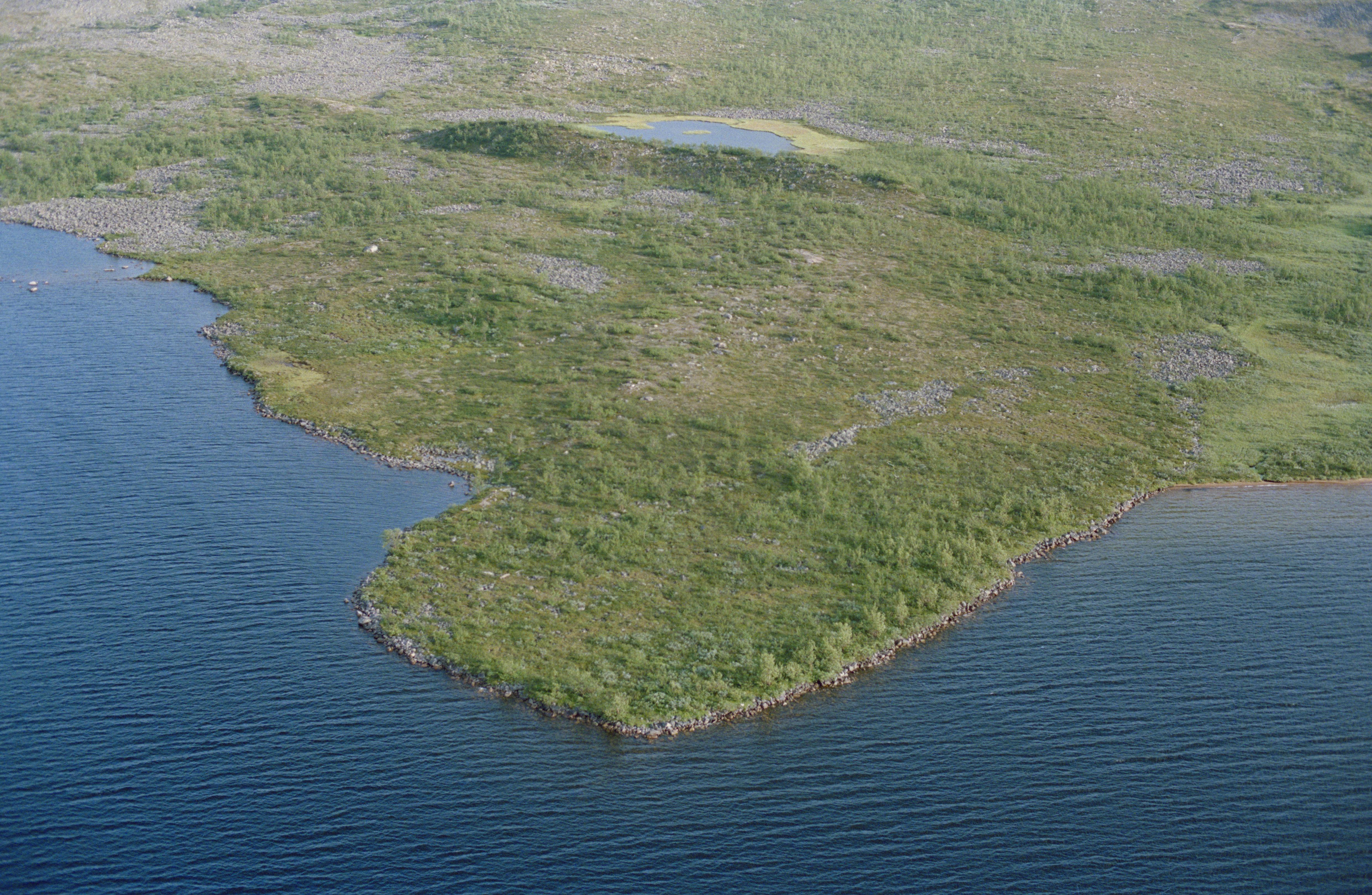 Beskrivning: Anmärkning (övrig): Området är väster om fornlämning RAÄnr Jukkasjärvi 2572 (ej i bilden). Beskrivning: Sjön Kiepanjaure (Giehpanjávri / Kiehpanjärvi), södra stranden. Till vänster i bildens övre del området under berget Giehpanvárri. Över bildens mitt sjön Darfaljaure (Darfáljávri). Bilden är tagen mot (väderstreck): SV Fotosyfte: Flygbildsdokumentation