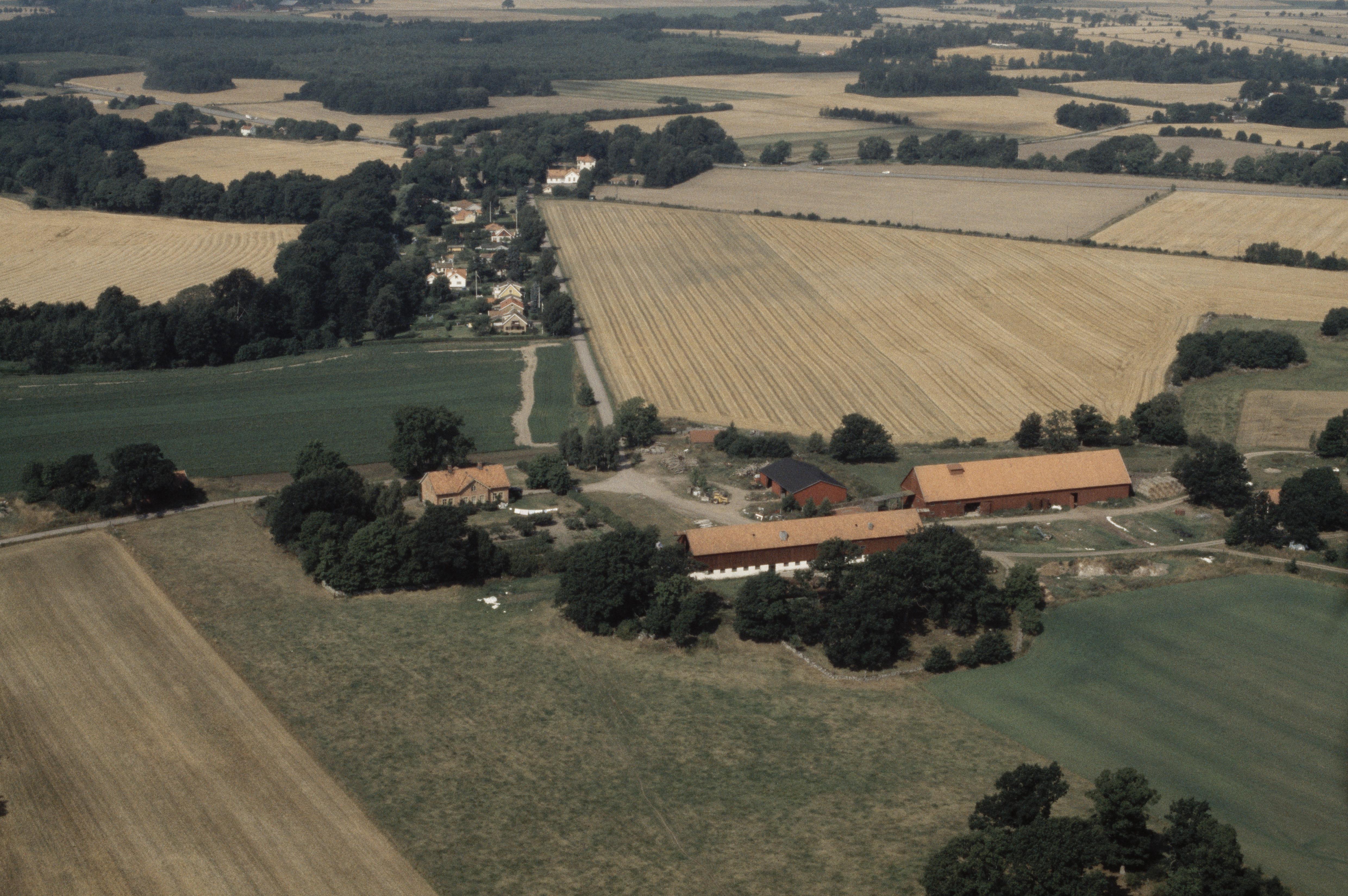 Beskrivning: Hossmo herrgård / säteri / kungsgård. Till vänster i bildens övre del Hossmo kyrka vid Ljungbyån. Bilden är tagen mot (väderstreck): V