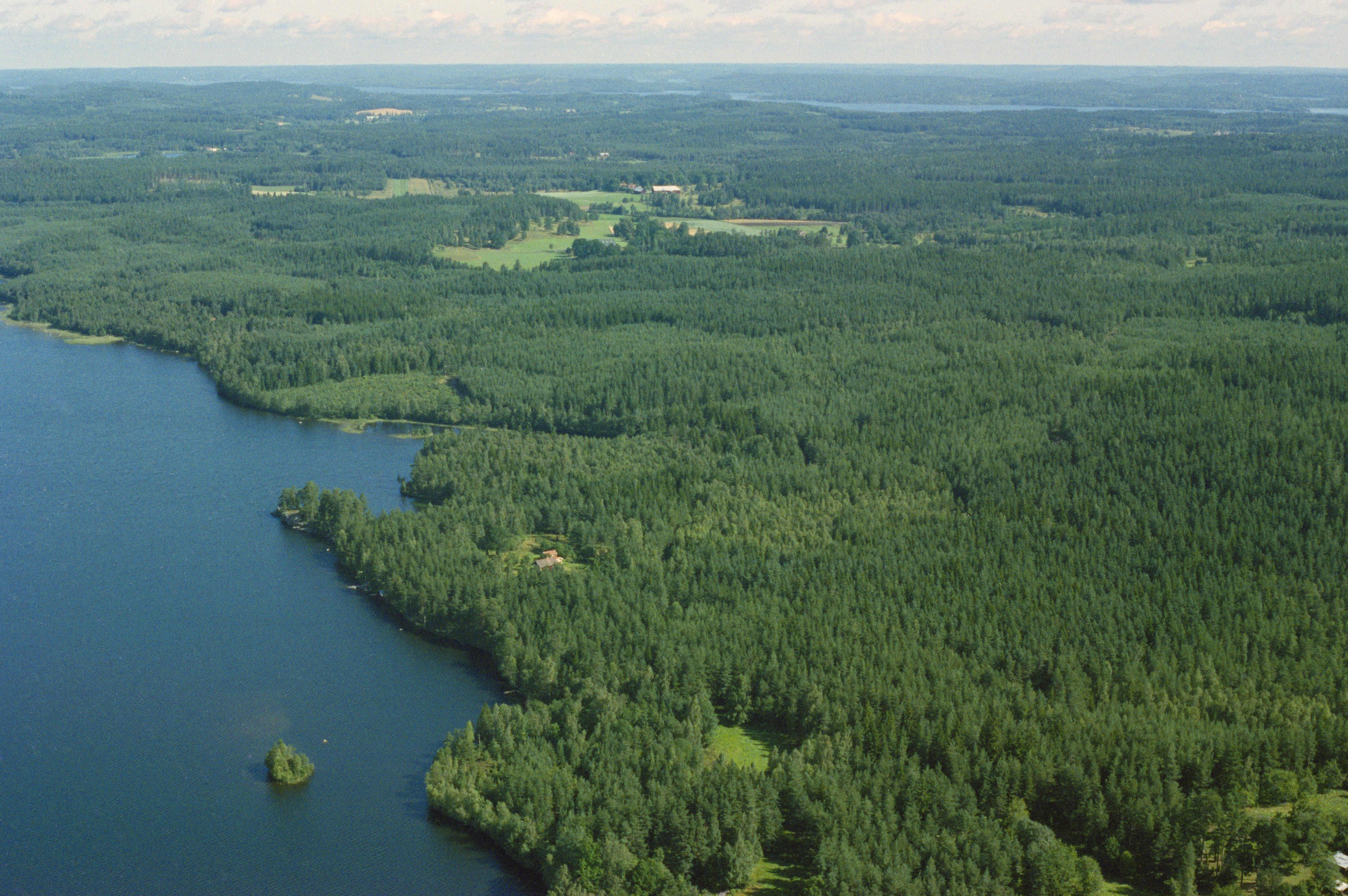 Beskrivning: I bildens nedre del Sjöbo vid Stora Sundsjön. I bildens övre del gravfält RAÄnr Sund 145:1. Bilden är tagen mot (väderstreck): NNO