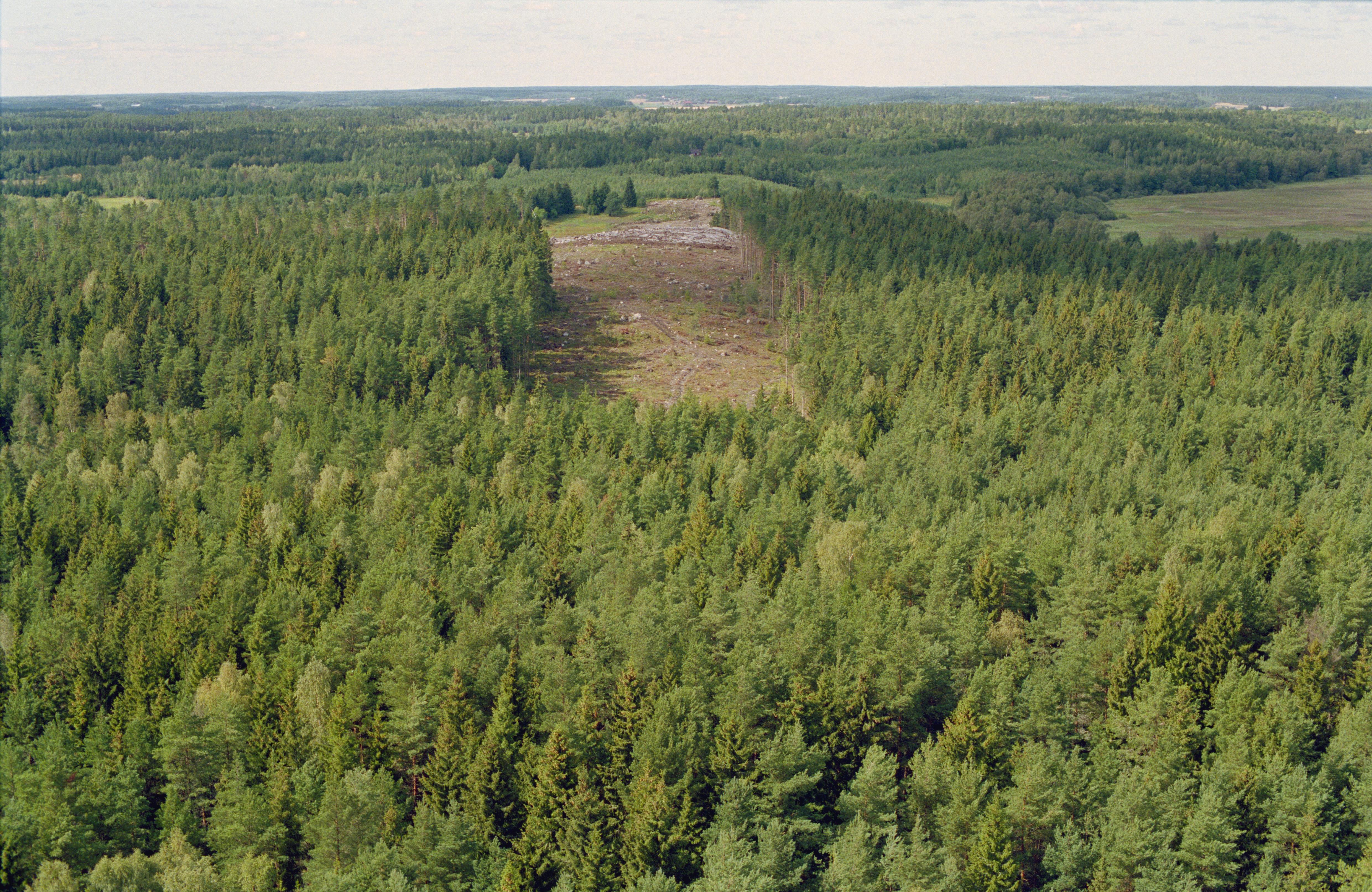 Beskrivning: Arkeologisk undersökning innan bygge av järnväg (Arlandabanan) i Rickebyåns dalgång i områden söder om Svartsjön. Över bildens mitt fornborg Odensala 235:1, boplats Odensala 489:1, m.fl. Bilden är tagen mot (väderstreck): V