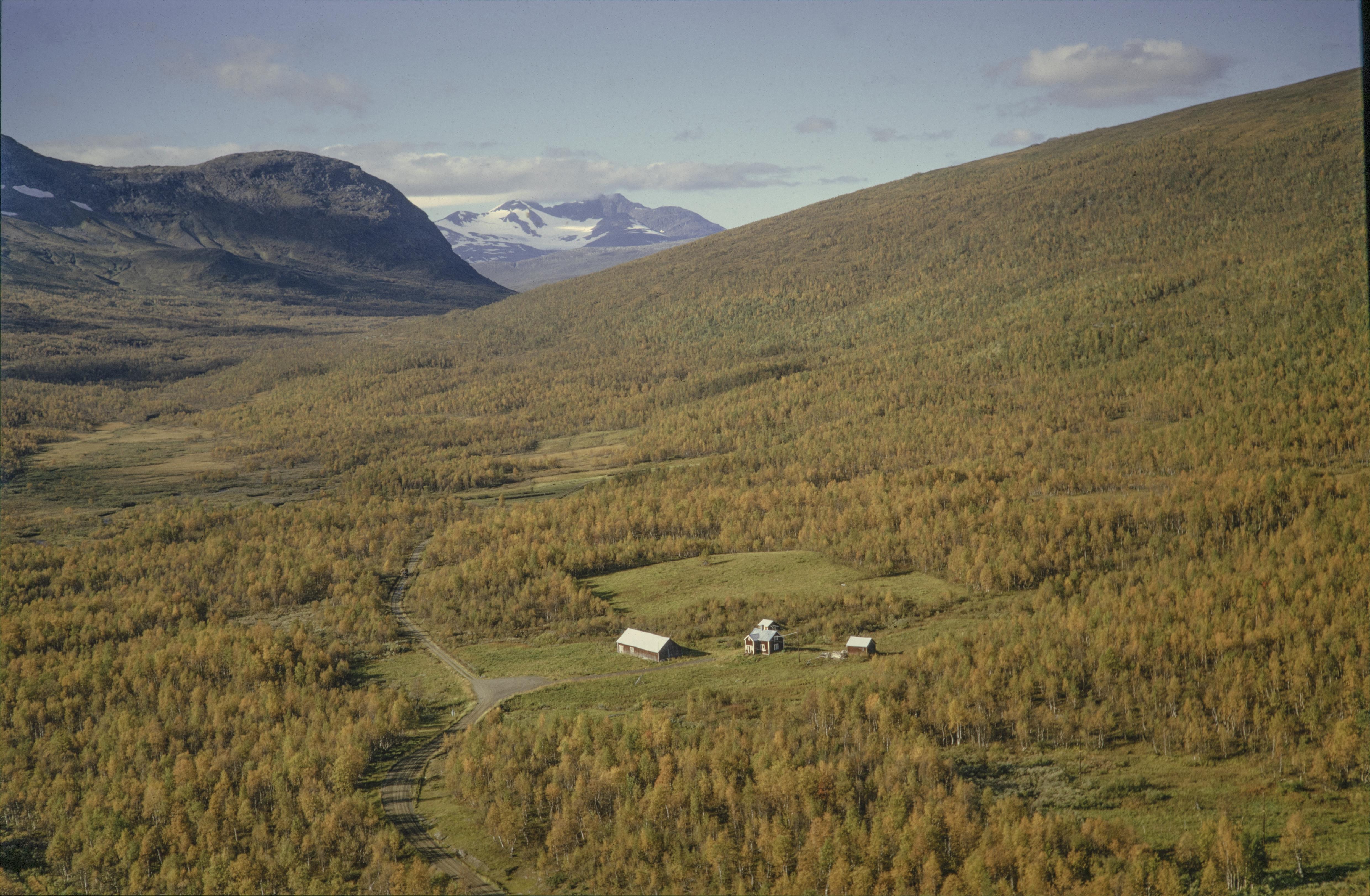 Beskrivning: Västra delen av Rönäs by i västra ändan av Tängvattnet, norr om Långtjärnen. Tängvattsbäckens dalgång (Diekngebåvloe) uppe till vänster med stalotomt RAÄnr Tärna 220:1-2. Bilden är tagen mot (väderstreck): NV