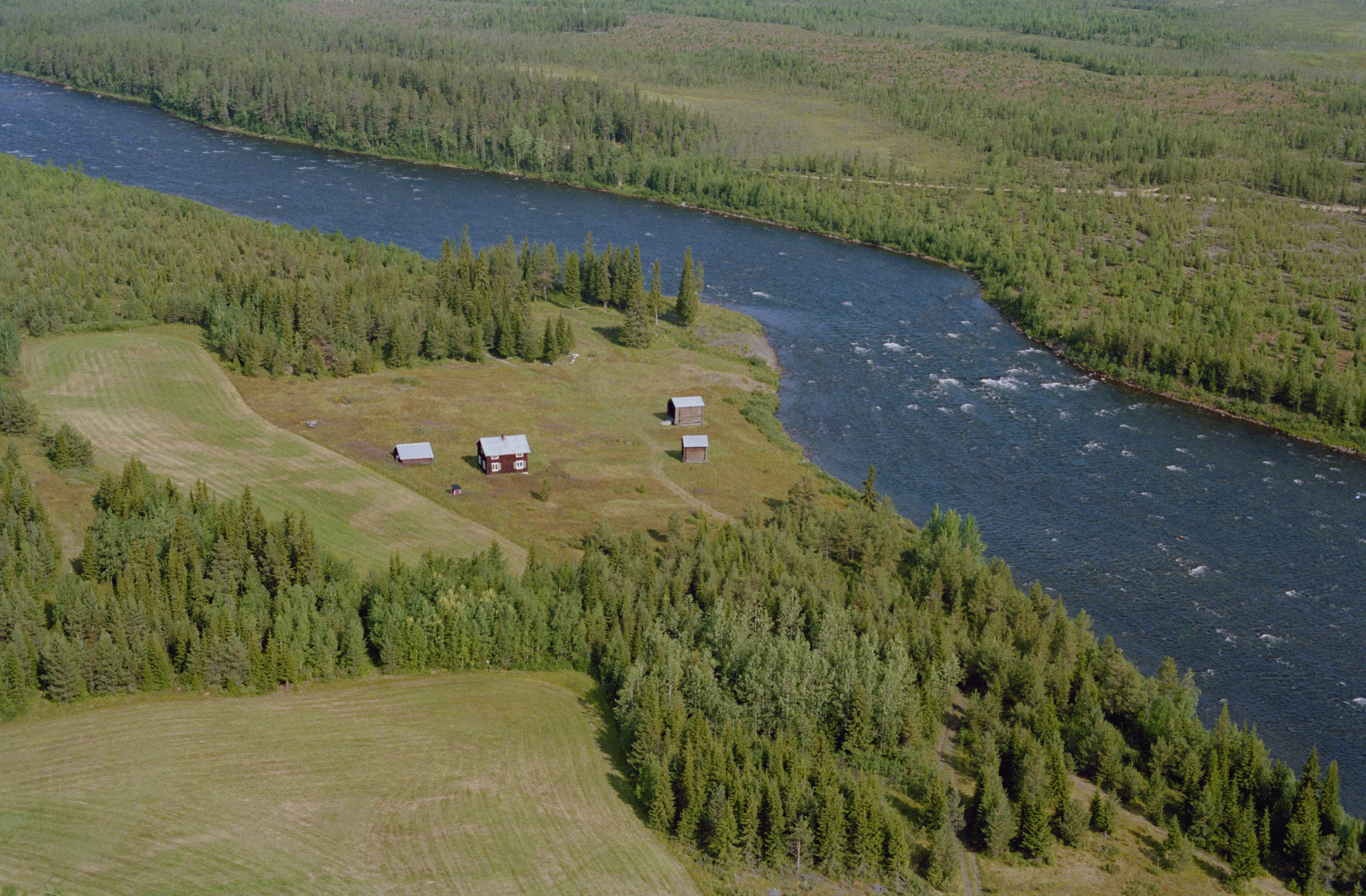 Beskrivning: Palokorva bruk vid Torneälven i Tornedalen. Nere till höger bytomt RAÄnr Junosuando 183:1. Över bildens mitt gravplats och hyttlämning RAÄnr Junosuando 1:1-2. Bilden är tagen mot (väderstreck): N