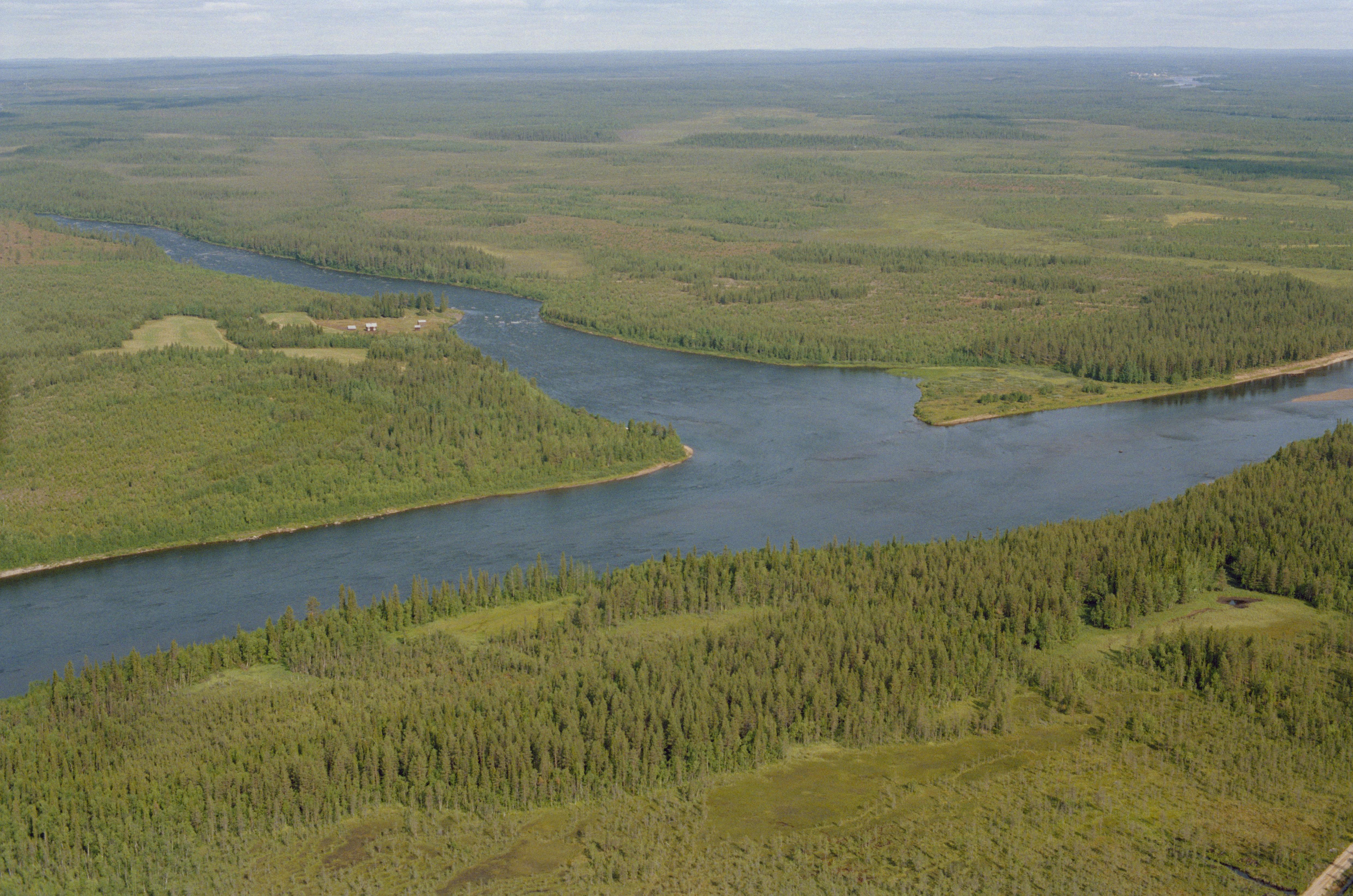 Beskrivning: Palokorva bruk i Tornedalen vid Lainioälvens mynning i Torneälven. Vid bildens mitt gravplats och hyttlämning RAÄnr Junosuando 1:1, bytomt Junosuando 183:1, boplats Junosuando 150:1, m.m. Bilden är tagen mot (väderstreck): N