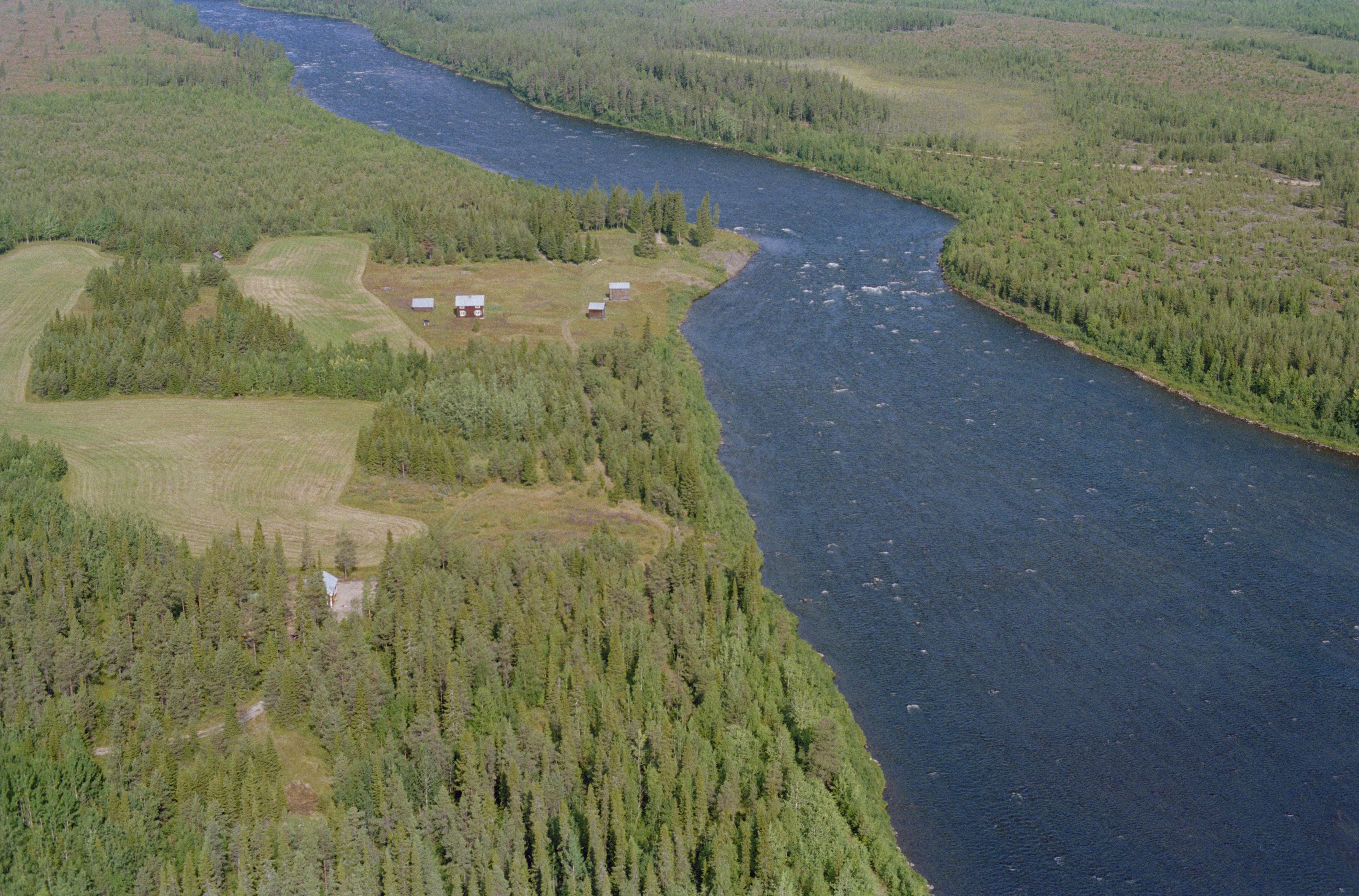 Beskrivning: Palokorva bruk vid Torneälven i Tornedalen. Vid bildens mitt bytomt RAÄnr Junosuando 183:1. Över bildens mitt gravplats och hyttlämning RAÄnr Junosuando 1:1-2. Bilden är tagen mot (väderstreck): NNV
