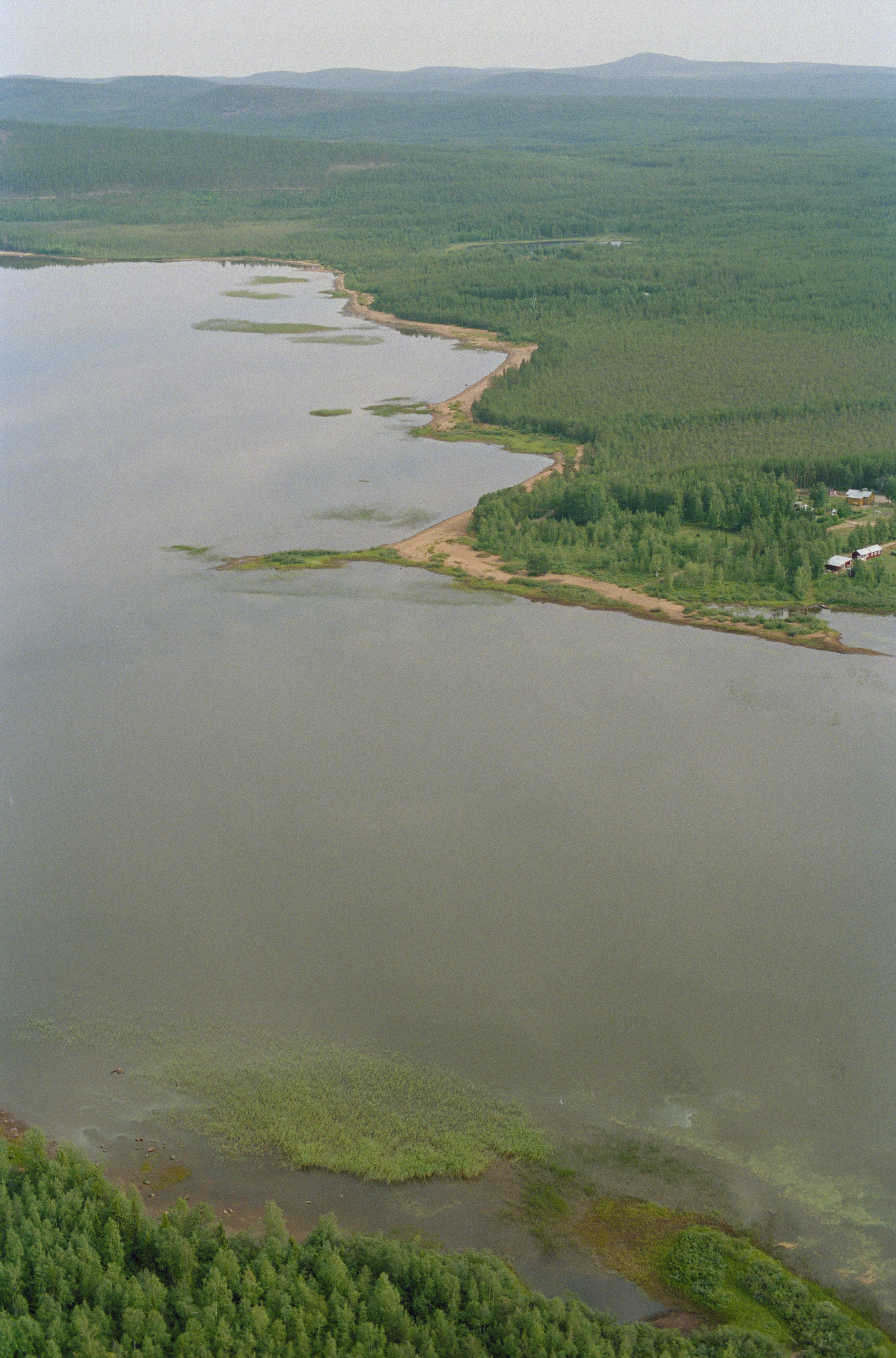 Beskrivning: I bildens nedre del norra delen av Storsundet i sjön Övre Lansjärv. Till höger över bildens mitt området Stubblandet med boplats RAÄnr Överkalix 9:1. Bilden är tagen mot (väderstreck): NNO