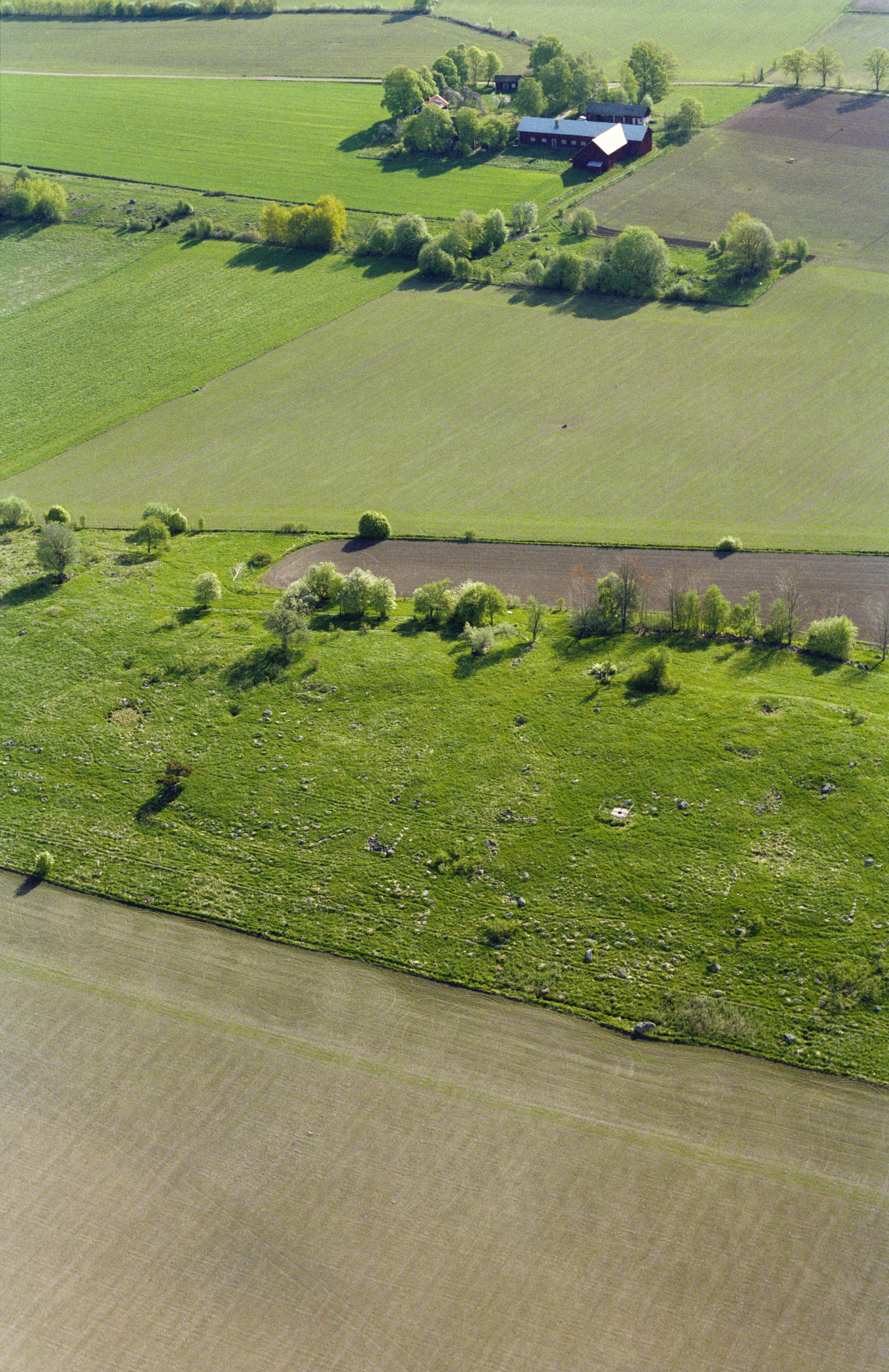 Beskrivning: Drumlinområde. Tjugesta gamla tomt RAÄnr Hackvad 34:1. Här låg under medeltiden ett trettiotal byggnader. Bilden är tagen mot (väderstreck): ONO