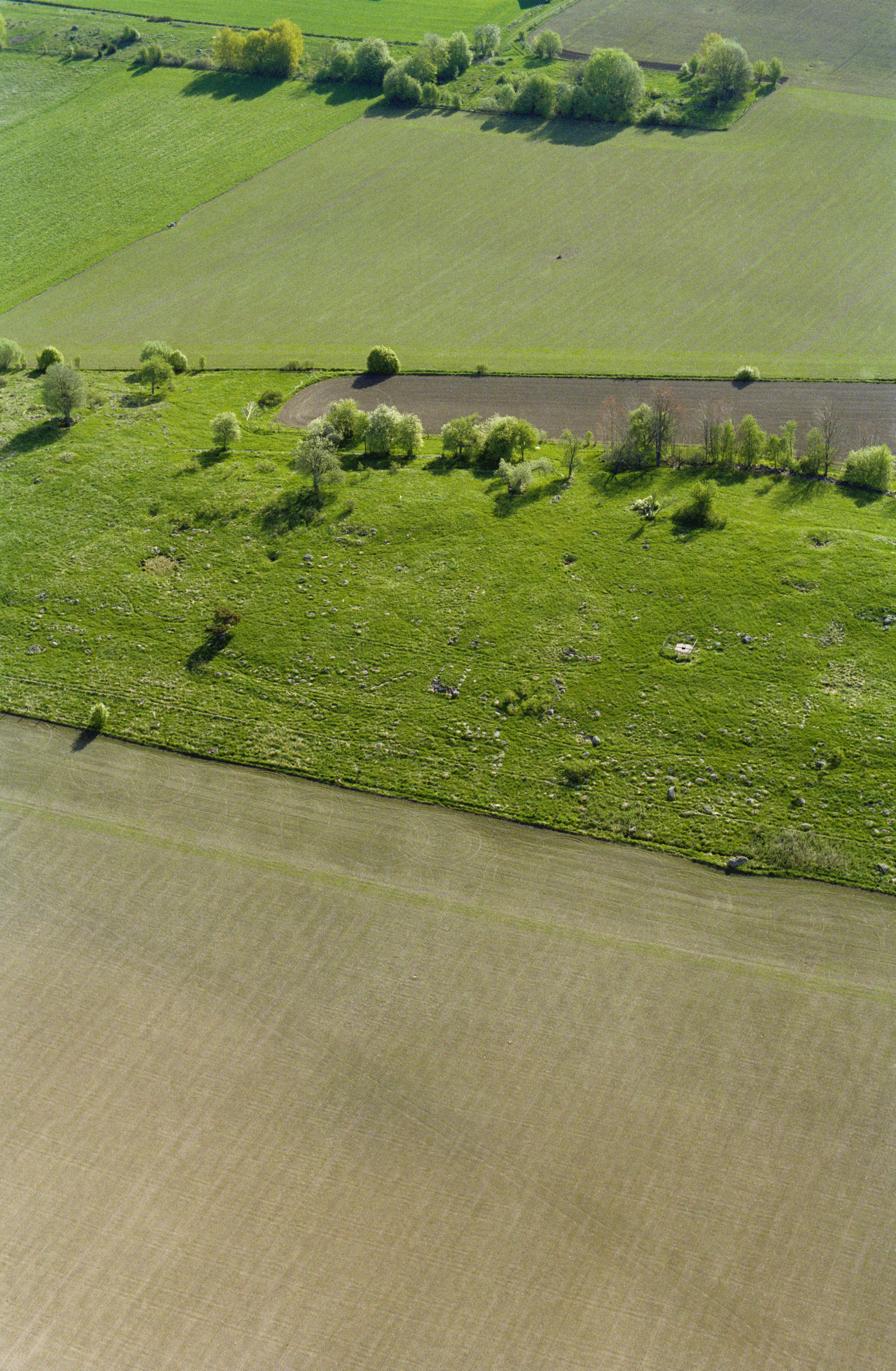 Beskrivning: Drumlinområde. Tjugesta gamla tomt RAÄnr Hackvad 34:1. Här låg under medeltiden ett trettiotal byggnader. Bilden är tagen mot (väderstreck): ONO