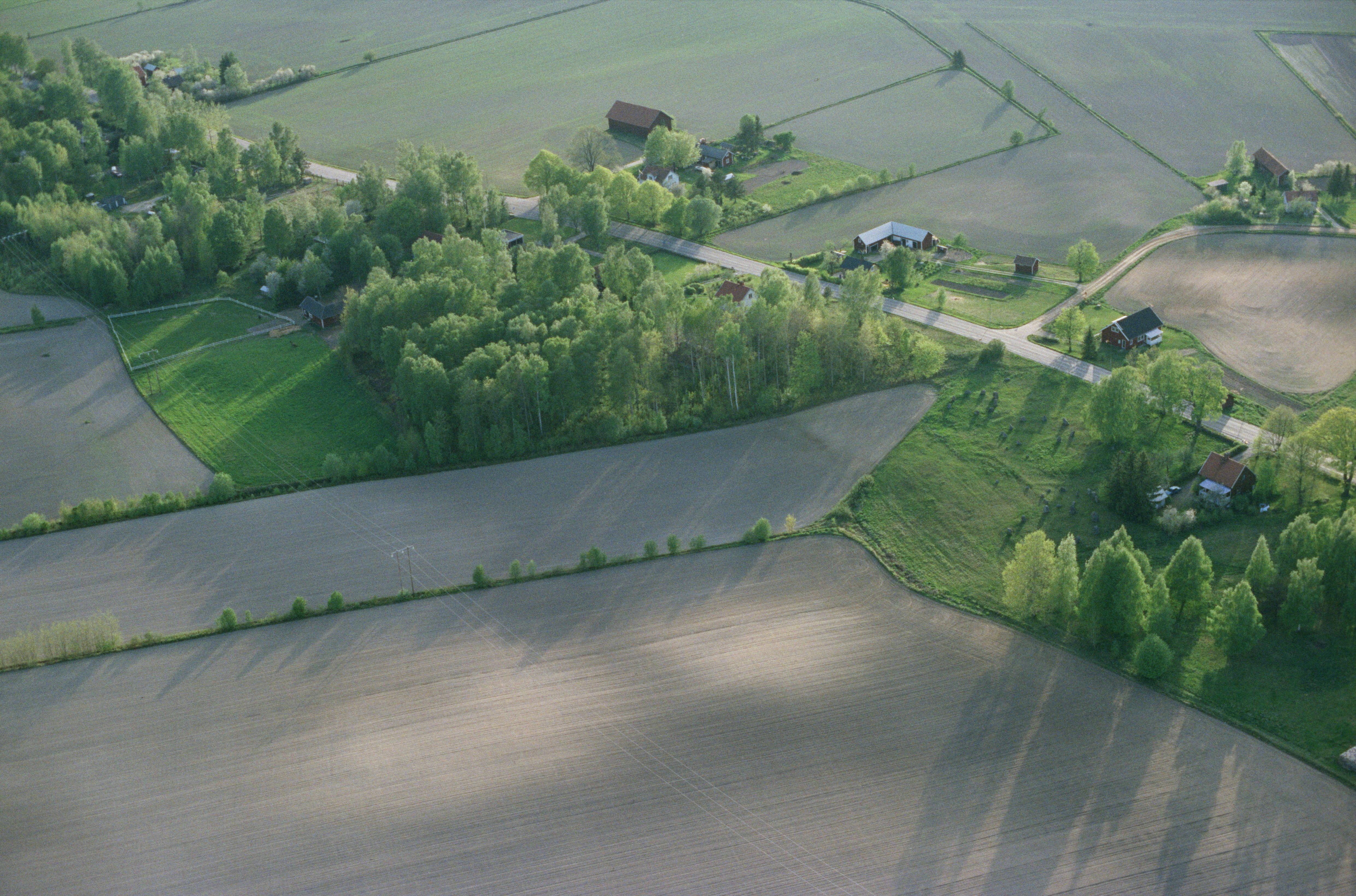 Beskrivning: Sannaheds by vid gränsen mot Kumla socken (uppe till höger). Gravfält RAÄnr Hallsberg 102:1 bestående av 25 fornlämningar: 4 domarringar, 15 resta stenar och 6 klumpstenar. Bilden är tagen mot (väderstreck): VSV