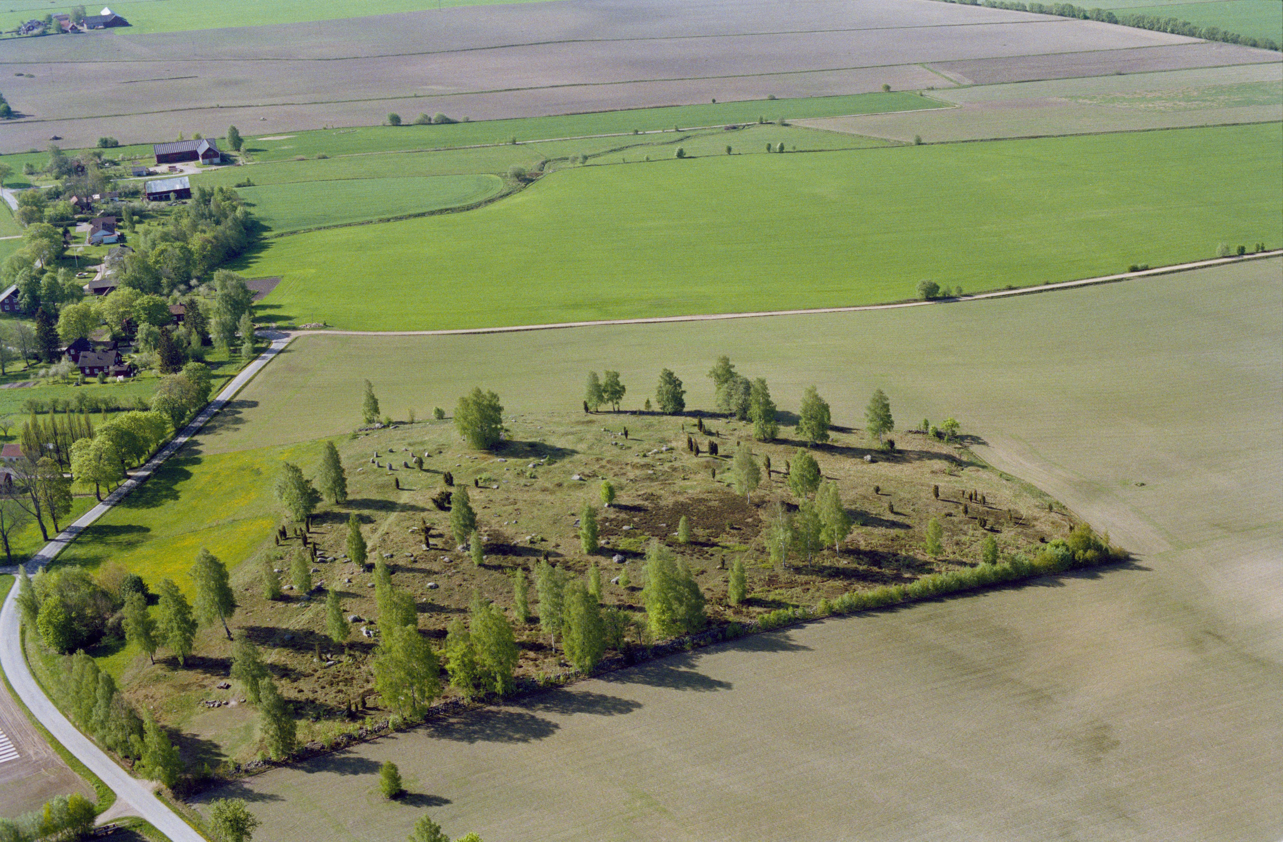 Beskrivning: Fossil åker och gravfält Lekebacken RAÄnr Kumla 35:1-2 i Hjortsberga by. Bilden är tagen mot (väderstreck): SSV
