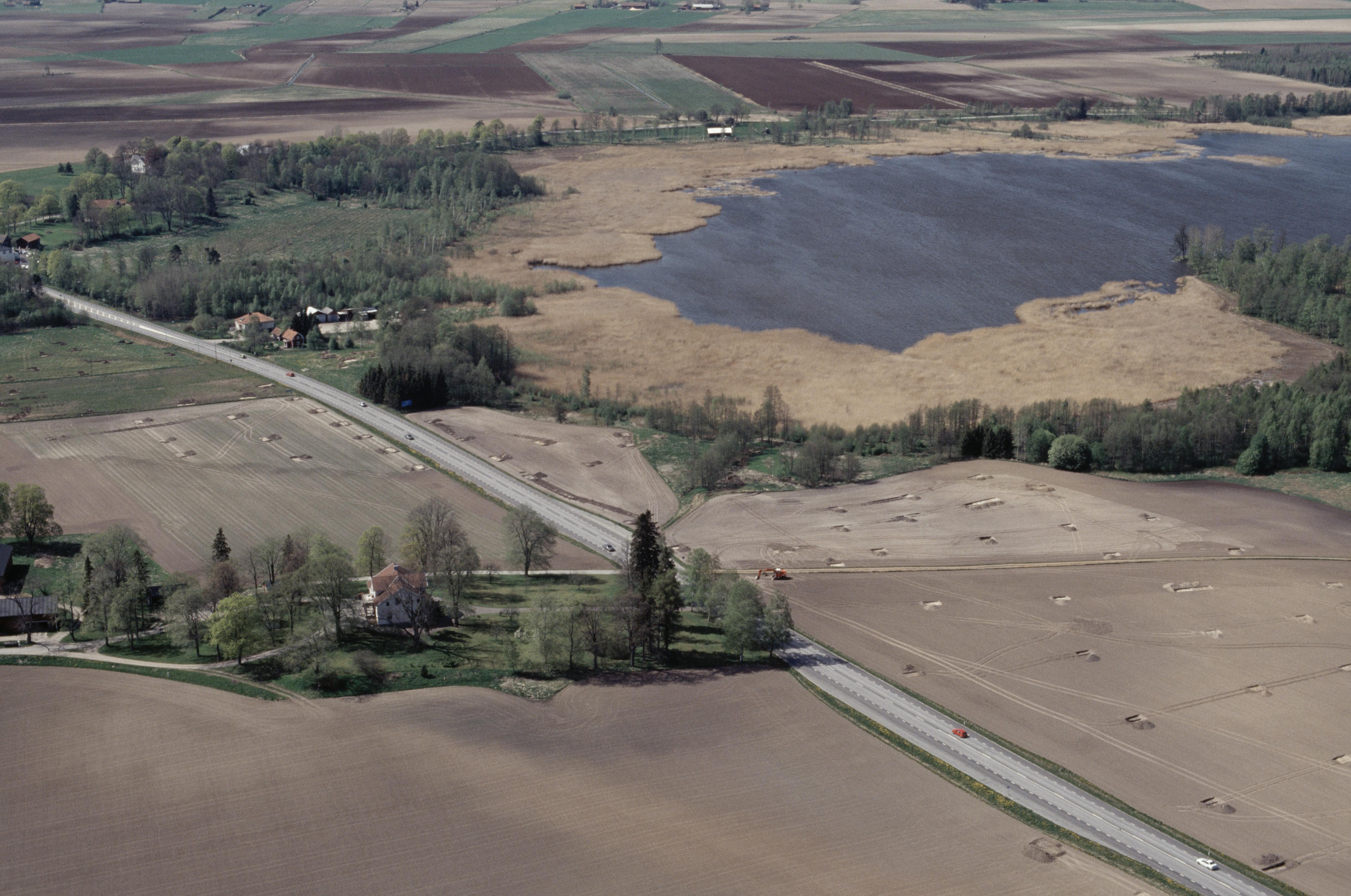 Beskrivning: Arkeologisk undersökning innan vägbygge av E3 / E20 söder om Vibysjön. Bytomt RAÄnr Viby 122:1 och 222:1. Till vänster i bildens övre del gårdarna Stora och Lilla Vretstorp. Bilden är tagen mot (väderstreck): NV